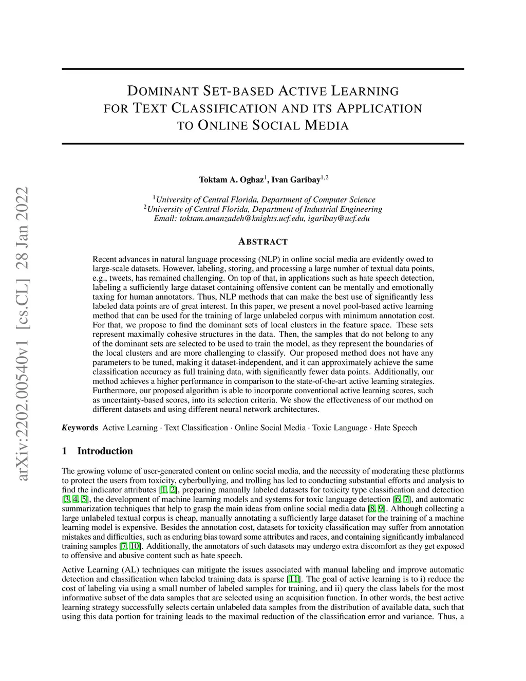 Recent advances in natural language processing (NLP) in online social media are evidently owed to large-scale datasets. However, labeling, storing, and processing a large number of textual data points, e.g., tweets, has remained challenging. On top of that, in applications such as hate speech detection, labeling a sufficiently large dataset containing offensive content can be mentally and emotionally taxing for human annotators. Thus, NLP methods that can make the best use of significantly less labeled data points are of great interest. In this paper, we present a novel pool-based active learning method that can be used for the training of large unlabeled corpus with minimum annotation cost. For that, we propose to find the dominant sets of local clusters in the feature space. These sets represent maximally cohesive structures in the data. Then, the samples that do not belong to any of the dominant sets are selected to be used to train the model, as they represent the boundaries of the local clusters and are more challenging to classify. Our proposed method does not have any parameters to be tuned, making it dataset-independent, and it can approximately achieve the same classification accuracy as full training data, with significantly fewer data points. Additionally, our method achieves a higher performance in comparison to the state-of-the-art active learning strategies. Furthermore, our proposed algorithm is able to incorporate conventional active learning scores, such as uncertainty-based scores, into its selection criteria. We show the effectiveness of our method on different datasets and using different neural network architectures.