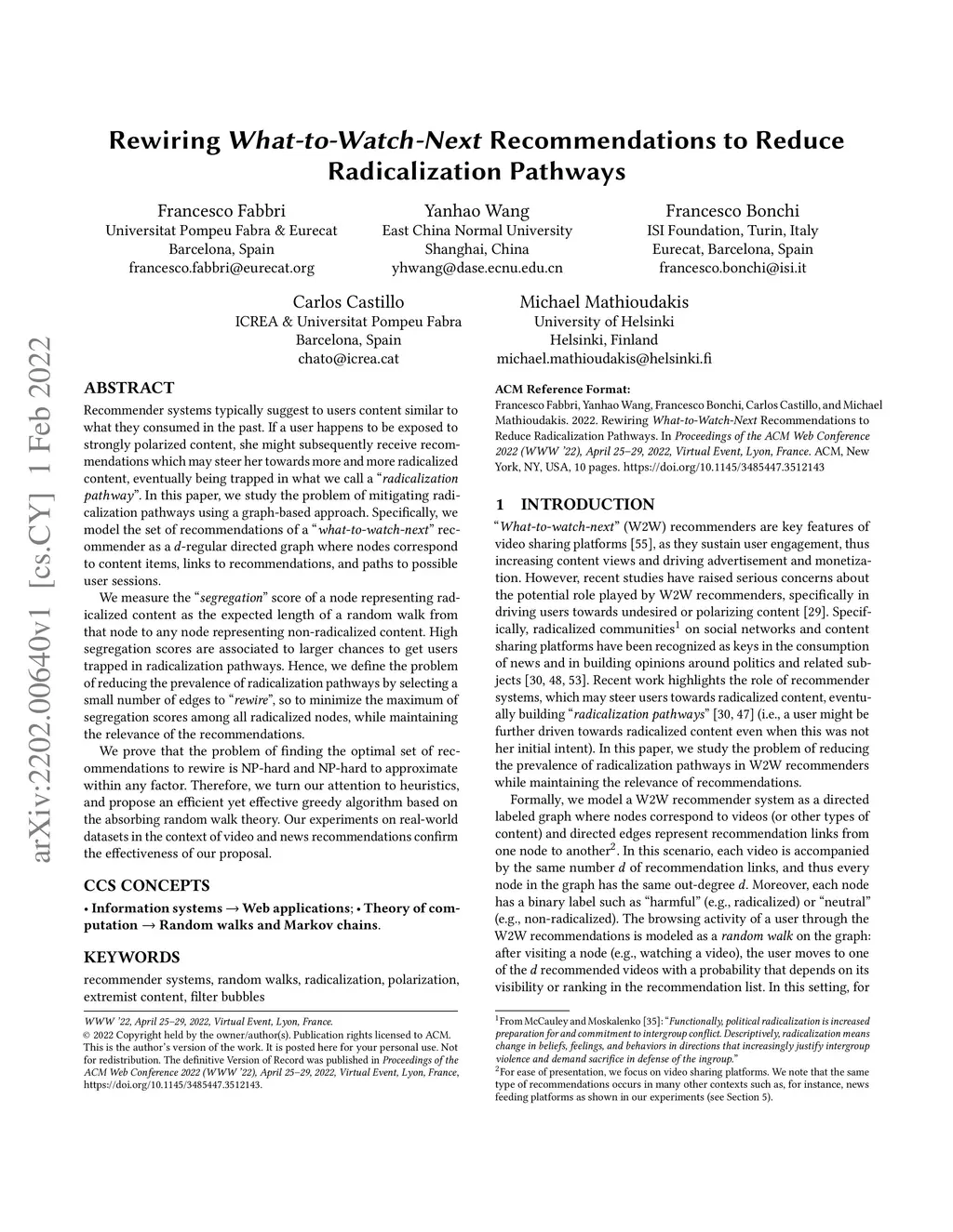 Recommender systems typically suggest to users content similar to what they consumed in the past. If a user happens to be exposed to strongly polarized content, she might subsequently receive recommendations which may steer her towards more and more radicalized content, eventually being trapped in what we call a "radicalization pathway". In this paper, we study the problem of mitigating radicalization pathways using a graph-based approach. Specifically, we model the set of recommendations of a "what-to-watch-next" recommender as a d-regular directed graph where nodes correspond to content items, links to recommendations, and paths to possible user sessions. We measure the "segregation" score of a node representing radicalized content as the expected length of a random walk from that node to any node representing non-radicalized content. High segregation scores are associated to larger chances to get users trapped in radicalization pathways. Hence, we define the problem of reducing the prevalence of radicalization pathways by selecting a small number of edges to "rewire", so to minimize the maximum of segregation scores among all radicalized nodes, while maintaining the relevance of the recommendations. We prove that the problem of finding the optimal set of recommendations to rewire is NP-hard and NP-hard to approximate within any factor. Therefore, we turn our attention to heuristics, and propose an efficient yet effective greedy algorithm based on the absorbing random walk theory. Our experiments on real-world datasets in the context of video and news recommendations confirm the effectiveness of our proposal.