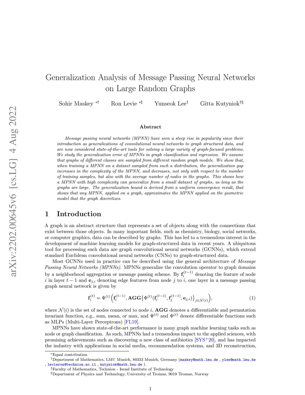 Message passing neural networks (MPNN) have seen a steep rise in popularity since their introduction as generalizations of convolutional neural networks to graph-structured data, and are now considered state-of-the-art tools for solving a large variety of graph-focused problems. We study the generalization error of MPNNs in graph classification and regression. We assume that graphs of different classes are sampled from different random graph models. We show that, when training a MPNN on a dataset sampled from such a distribution, the generalization gap increases in the complexity of the MPNN, and decreases, not only with respect to the number of training samples, but also with the average number of nodes in the graphs. This shows how a MPNN with high complexity can generalize from a small dataset of graphs, as long as the graphs are large. The generalization bound is derived from a uniform convergence result, that shows that any MPNN, applied on a graph, approximates the MPNN applied on the geometric model that the graph discretizes.