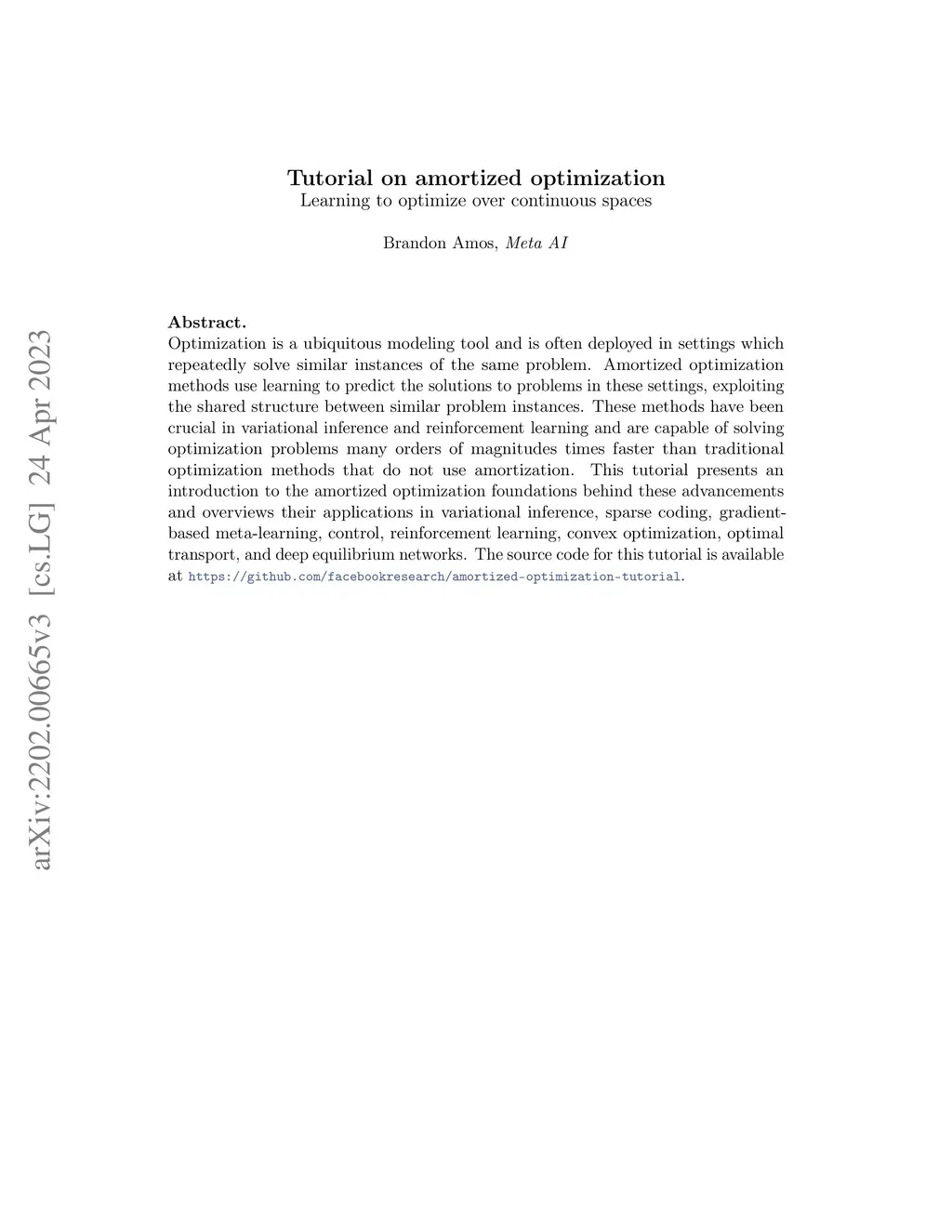 Optimization is a ubiquitous modeling tool and is often deployed in settings which repeatedly solve similar instances of the same problem. Amortized optimization methods use learning to predict the solutions to problems in these settings, exploiting the shared structure between similar problem instances. These methods have been crucial in variational inference and reinforcement learning and are capable of solving optimization problems many orders of magnitudes faster than traditional optimization methods that do not use amortization. This tutorial presents an introduction to the amortized optimization foundations behind these advancements and overviews their applications in variational inference, sparse coding, gradient-based meta-learning, control, reinforcement learning, convex optimization, optimal transport, and deep equilibrium networks. The source code for this tutorial is available atthis https URL.