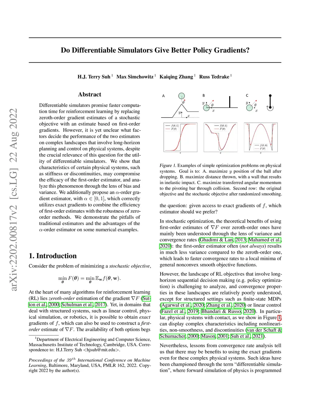 Differentiable simulators promise faster computation time for reinforcement learning by replacing zeroth-order gradient estimates of a stochastic objective with an estimate based on first-order gradients. However, it is yet unclear what factors decide the performance of the two estimators on complex landscapes that involve long-horizon planning and control on physical systems, despite the crucial relevance of this question for the utility of differentiable simulators. We show that characteristics of certain physical systems, such as stiffness or discontinuities, may compromise the efficacy of the first-order estimator, and analyze this phenomenon through the lens of bias and variance. We additionally propose an -order gradient estimator, with , which correctly utilizes exact gradients to combine the efficiency of first-order estimates with the robustness of zero-order methods. We demonstrate the pitfalls of traditional estimators and the advantages of the -order estimator on some numerical examples.