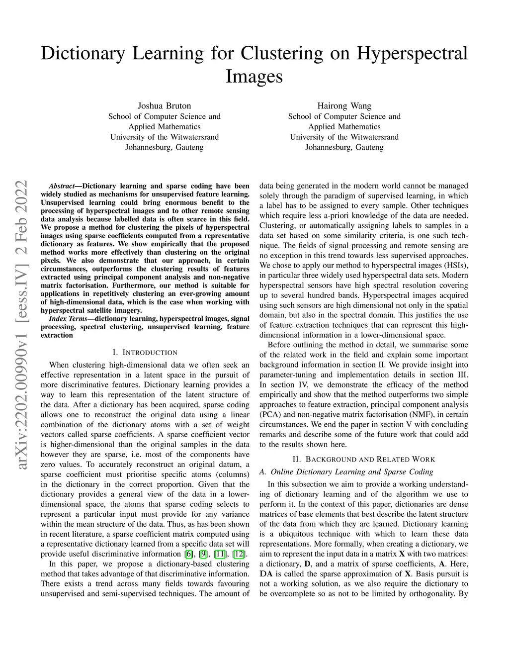Dictionary learning and sparse coding have been widely studied as mechanisms for unsupervised feature learning. Unsupervised learning could bring enormous benefit to the processing of hyperspectral images and to other remote sensing data analysis because labelled data are often scarce in this field. We propose a method for clustering the pixels of hyperspectral images using sparse coefficients computed from a representative dictionary as features. We show empirically that the proposed method works more effectively than clustering on the original pixels. We also demonstrate that our approach, in certain circumstances, outperforms the clustering results of features extracted using principal component analysis and non-negative matrix factorisation. Furthermore, our method is suitable for applications in repetitively clustering an ever-growing amount of high-dimensional data, which is the case when working with hyperspectral satellite imagery.