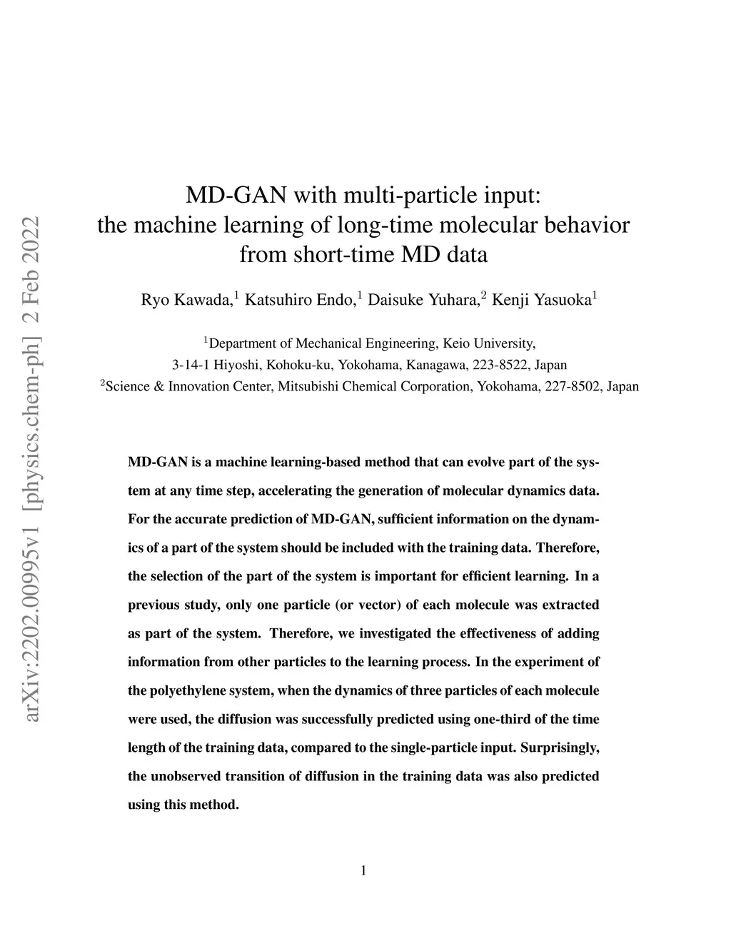 MD-GAN is a machine learning-based method that can evolve part of the system at any time step, accelerating the generation of molecular dynamics data. For the accurate prediction of MD-GAN, sufficient information on the dynamics of a part of the system should be included with the training data. Therefore, the selection of the part of the system is important for efficient learning. In a previous study, only one particle (or vector) of each molecule was extracted as part of the system. Therefore, we investigated the effectiveness of adding information from other particles to the learning process. In the experiment of the polyethylene system, when the dynamics of three particles of each molecule were used, the diffusion was successfully predicted using one-third of the time length of the training data, compared to the single-particle input. Surprisingly, the unobserved transition of diffusion in the training data was also predicted using this method.