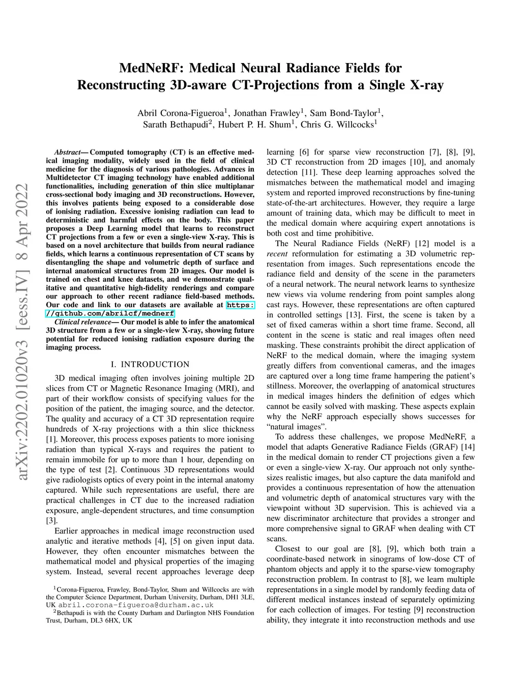 Computed tomography (CT) is an effective medical imaging modality, widely used in the field of clinical medicine for the diagnosis of various pathologies. Advances in Multidetector CT imaging technology have enabled additional functionalities, including generation of thin slice multiplanar cross-sectional body imaging and 3D reconstructions. However, this involves patients being exposed to a considerable dose of ionising radiation. Excessive ionising radiation can lead to deterministic and harmful effects on the body. This paper proposes a Deep Learning model that learns to reconstruct CT projections from a few or even a single-view X-ray. This is based on a novel architecture that builds from neural radiance fields, which learns a continuous representation of CT scans by disentangling the shape and volumetric depth of surface and internal anatomical structures from 2D images. Our model is trained on chest and knee datasets, and we demonstrate qualitative and quantitative high-fidelity renderings and compare our approach to other recent radiance field-based methods. Our code and link to our datasets are available at https://github.com/abrilcf/mednerf