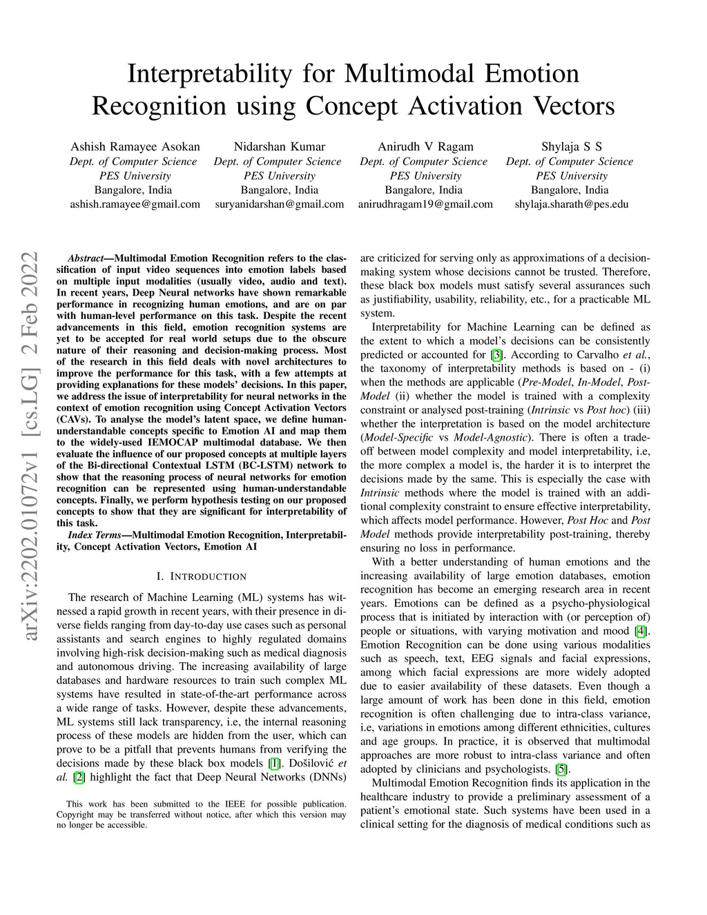 Multimodal Emotion Recognition refers to the classification of input video sequences into emotion labels based on multiple input modalities (usually video, audio and text). In recent years, Deep Neural networks have shown remarkable performance in recognizing human emotions, and are on par with human-level performance on this task. Despite the recent advancements in this field, emotion recognition systems are yet to be accepted for real world setups due to the obscure nature of their reasoning and decision-making process. Most of the research in this field deals with novel architectures to improve the performance for this task, with a few attempts at providing explanations for these models' decisions. In this paper, we address the issue of interpretability for neural networks in the context of emotion recognition using Concept Activation Vectors (CAVs). To analyse the model's latent space, we define human-understandable concepts specific to Emotion AI and map them to the widely-used IEMOCAP multimodal database. We then evaluate the influence of our proposed concepts at multiple layers of the Bi-directional Contextual LSTM (BC-LSTM) network to show that the reasoning process of neural networks for emotion recognition can be represented using human-understandable concepts. Finally, we perform hypothesis testing on our proposed concepts to show that they are significant for interpretability of this task.