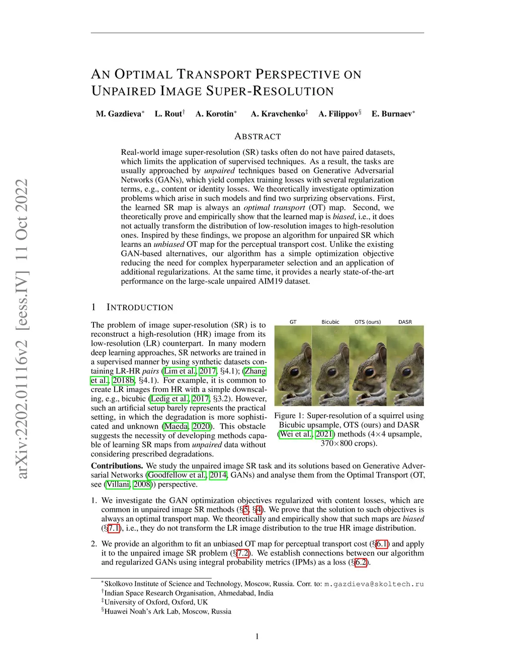 Real-world image super-resolution (SR) tasks often do not have paired datasets, which limits the application of supervised techniques. As a result, the tasks are usually approached by unpaired techniques based on Generative Adversarial Networks (GANs), which yield complex training losses with several regularization terms, e.g., content or identity losses. While GANs usually provide good practical performance, they are used heuristically, i.e., theoretical understanding of their behaviour is yet rather limited. We theoretically investigate optimization problems which arise in such models and find two surprising observations. First, the learned SR map is always an optimal transport (OT) map. Second, we theoretically prove and empirically show that the learned map is biased, i.e., it does not actually transform the distribution of low-resolution images to high-resolution ones. Inspired by these findings, we investigate recent advances in neural OT field to resolve the bias issue. We establish an intriguing connection between regularized GANs and neural OT approaches. We show that unlike the existing GAN-based alternatives, these algorithms aim to learn an unbiased OT map. We empirically demonstrate our findings via a series of synthetic and real-world unpaired SR experiments. Our source code is publicly available atthis https URL.