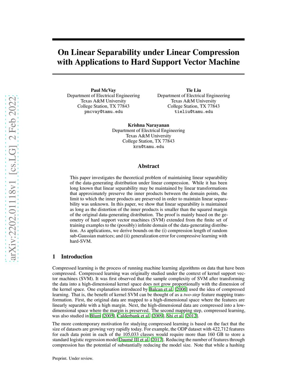 This paper investigates the theoretical problem of maintaining linear separability of the data-generating distribution under linear compression. While it has been long known that linear separability may be maintained by linear transformations that approximately preserve the inner products between the domain points, the limit to which the inner products are preserved in order to maintain linear separability was unknown. In this paper, we show that linear separability is maintained as long as the distortion of the inner products is smaller than the squared margin of the original data-generating distribution. The proof is mainly based on the geometry of hard support vector machines (SVM) extended from the finite set of training examples to the (possibly) infinite domain of the data-generating distribution. As applications, we derive bounds on the (i) compression length of random sub-Gaussian matrices; and (ii) generalization error for compressive learning with hard-SVM.