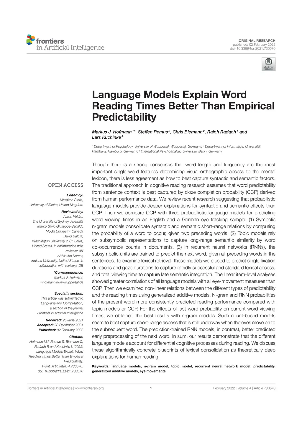 Though there is a strong consensus that word length and frequency are the most important single-word features determining visual-orthographic access to the mental lexicon, there is less agreement as how to best capture syntactic and semantic factors. The traditional approach in cognitive reading research assumes that word predictability from sentence context is best captured by cloze completion probability (CCP) derived from human performance data. We review recent research suggesting that probabilistic language models provide deeper explanations for syntactic and semantic effects than CCP. Then we compare CCP with (1) Symbolic n-gram models consolidate syntactic and semantic short-range relations by computing the probability of a word to occur, given two preceding words. (2) Topic models rely on subsymbolic representations to capture long-range semantic similarity by word co-occurrence counts in documents. (3) In recurrent neural networks (RNNs), the subsymbolic units are trained to predict the next word, given all preceding words in the sentences. To examine lexical retrieval, these models were used to predict single fixation durations and gaze durations to capture rapidly successful and standard lexical access, and total viewing time to capture late semantic integration. The linear item-level analyses showed greater correlations of all language models with all eye-movement measures than CCP. Then we examined non-linear relations between the different types of predictability and the reading times using generalized additive models. N-gram and RNN probabilities of the present word more consistently predicted reading performance compared with topic models or CCP.