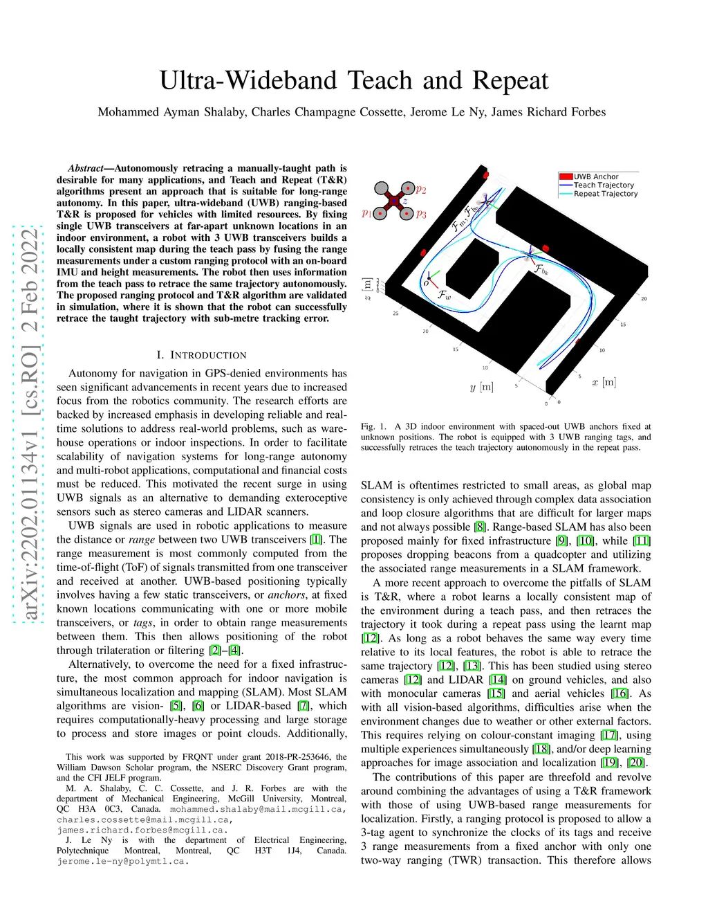 Autonomously retracing a manually-taught path is desirable for many applications, and Teach and Repeat (T&R) algorithms present an approach that is suitable for long-range autonomy. In this paper, ultra-wideband (UWB) ranging-based T&R is proposed for vehicles with limited resources. By fixing single UWB transceivers at far-apart unknown locations in an indoor environment, a robot with 3 UWB transceivers builds a locally consistent map during the teach pass by fusing the range measurements under a custom ranging protocol with an on-board IMU and height measurements. The robot then uses information from the teach pass to retrace the same trajectory autonomously. The proposed ranging protocol and T&R algorithm are validated in simulation, where it is shown that the robot can successfully retrace the taught trajectory with sub-metre tracking error.