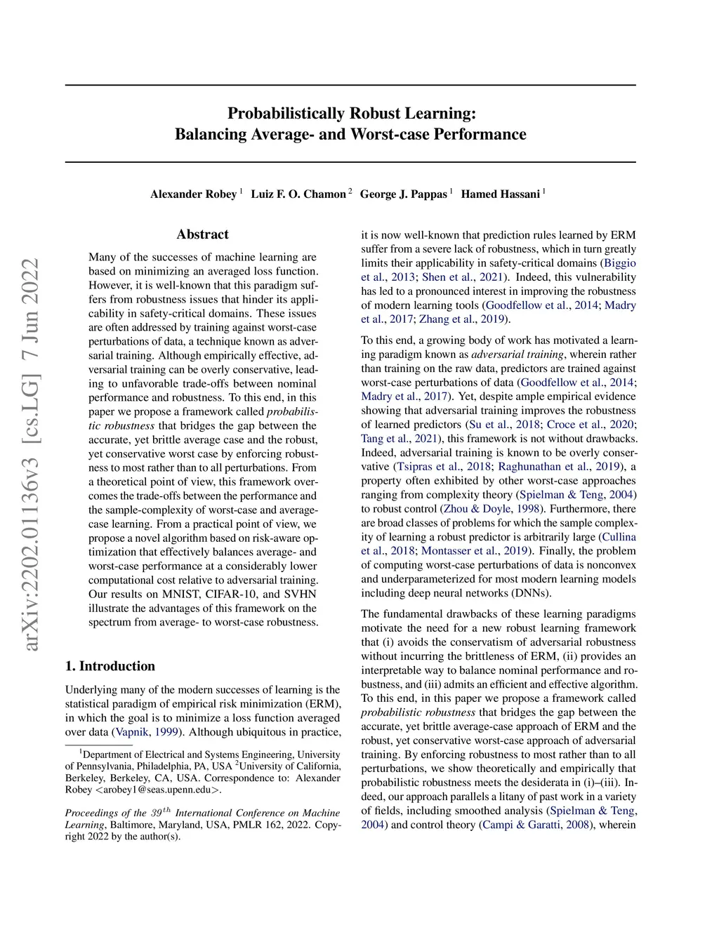 Many of the successes of machine learning are based on minimizing an averaged loss function. However, it is well-known that this paradigm suffers from robustness issues that hinder its applicability in safety-critical domains. These issues are often addressed by training against worst-case perturbations of data, a technique known as adversarial training. Although empirically effective, adversarial training can be overly conservative, leading to unfavorable trade-offs between nominal performance and robustness. To this end, in this paper we propose a framework called probabilistic robustness that bridges the gap between the accurate, yet brittle average case and the robust, yet conservative worst case by enforcing robustness to most rather than to all perturbations. From a theoretical point of view, this framework overcomes the trade-offs between the performance and the sample-complexity of worst-case and average-case learning. From a practical point of view, we propose a novel algorithm based on risk-aware optimization that effectively balances average- and worst-case performance at a considerably lower computational cost relative to adversarial training. Our results on MNIST, CIFAR-10, and SVHN illustrate the advantages of this framework on the spectrum from average- to worst-case robustness.