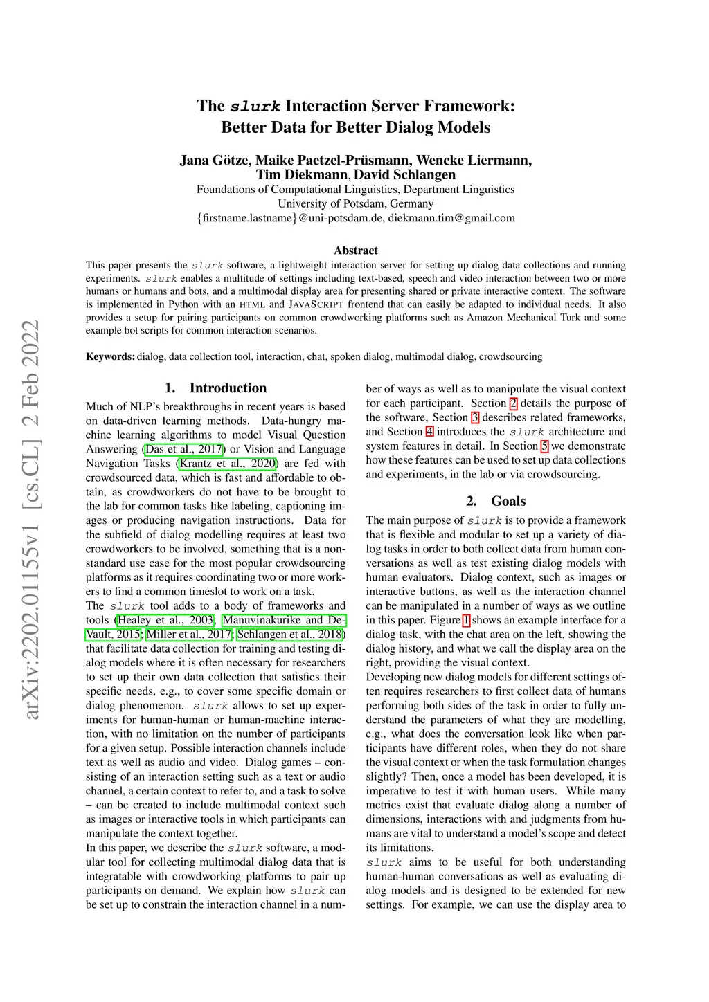This paper presents the slurk software, a lightweight interaction server for setting up dialog data collections and running experiments. Slurk enables a multitude of settings including text-based, speech and video interaction between two or more humans or humans and bots, and a multimodal display area for presenting shared or private interactive context. The software is implemented in Python with an HTML and JS frontend that can easily be adapted to individual needs. It also provides a setup for pairing participants on common crowdworking platforms such as Amazon Mechanical Turk and some example bot scripts for common interaction scenarios.