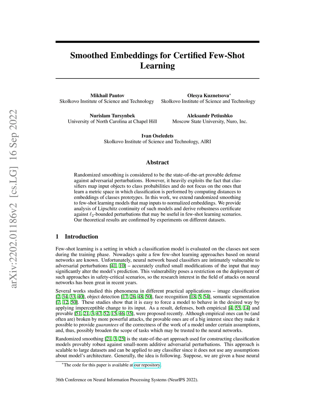 Randomized smoothing is considered to be the state-of-the-art provable defense against adversarial perturbations. However, it heavily exploits the fact that classifiers map input objects to class probabilities and do not focus on the ones that learn a metric space in which classification is performed by computing distances to embeddings of classes prototypes. In this work, we extend randomized smoothing to few-shot learning models that map inputs to normalized embeddings. We provide analysis of Lipschitz continuity of such models and derive robustness certificate against -bounded perturbations that may be useful in few-shot learning scenarios. Our theoretical results are confirmed by experiments on different datasets.