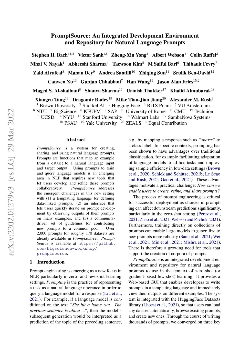 PromptSource is a system for creating, sharing, and using natural language prompts. Prompts are functions that map an example from a dataset to a natural language input and target output. Using prompts to train and query language models is an emerging area in NLP that requires new tools that let users develop and refine these prompts collaboratively. PromptSource addresses the emergent challenges in this new setting with (1) a templating language for defining data-linked prompts, (2) an interface that lets users quickly iterate on prompt development by observing outputs of their prompts on many examples, and (3) a community-driven set of guidelines for contributing new prompts to a common pool. Over 2,000 prompts for roughly 170 datasets are already available in PromptSource. PromptSource is available at https://github.com/bigscience-workshop/promptsource.