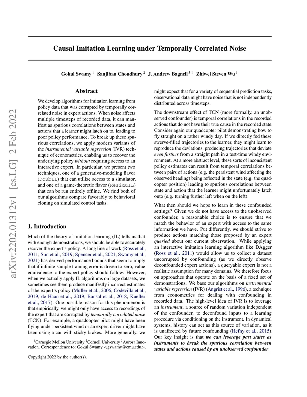 We develop algorithms for imitation learning from policy data that was corrupted by temporally correlated noise in expert actions. When noise affects multiple timesteps of recorded data, it can manifest as spurious correlations between states and actions that a learner might latch on to, leading to poor policy performance. To break up these spurious correlations, we apply modern variants of the instrumental variable regression (IVR) technique of econometrics, enabling us to recover the underlying policy without requiring access to an interactive expert. In particular, we present two techniques, one of a generative-modeling flavor (DoubIL) that can utilize access to a simulator, and one of a game-theoretic flavor (ResiduIL) that can be run entirely offline. We find both of our algorithms compare favorably to behavioral cloning on simulated control tasks.
