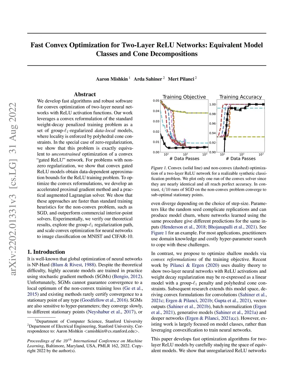 We develop fast algorithms and robust software for convex optimization of two-layer neural networks with ReLU activation functions. Our work leverages a convex reformulation of the standard weight-decay penalized training problem as a set of group--regularized data-local models, where locality is enforced by polyhedral cone constraints. In the special case of zero-regularization, we show that this problem is exactly equivalent to unconstrained optimization of a convex "gated ReLU" network with non-singular gates. For problems with non-zero regularization, we show that convex gated ReLU models obtain data-dependent approximation bounds for the ReLU training problem. To optimize the convex reformulations, we develop an accelerated proximal gradient method and a practical augmented Lagrangian solver. We show that these approaches are faster than standard training heuristics for the non-convex problem, such as SGD, and outperform commercial interior-point solvers. Experimentally, we verify our theoretical results, explore the group- regularization path, and scale convex optimization for neural networks to image classification on MNIST and CIFAR-10.