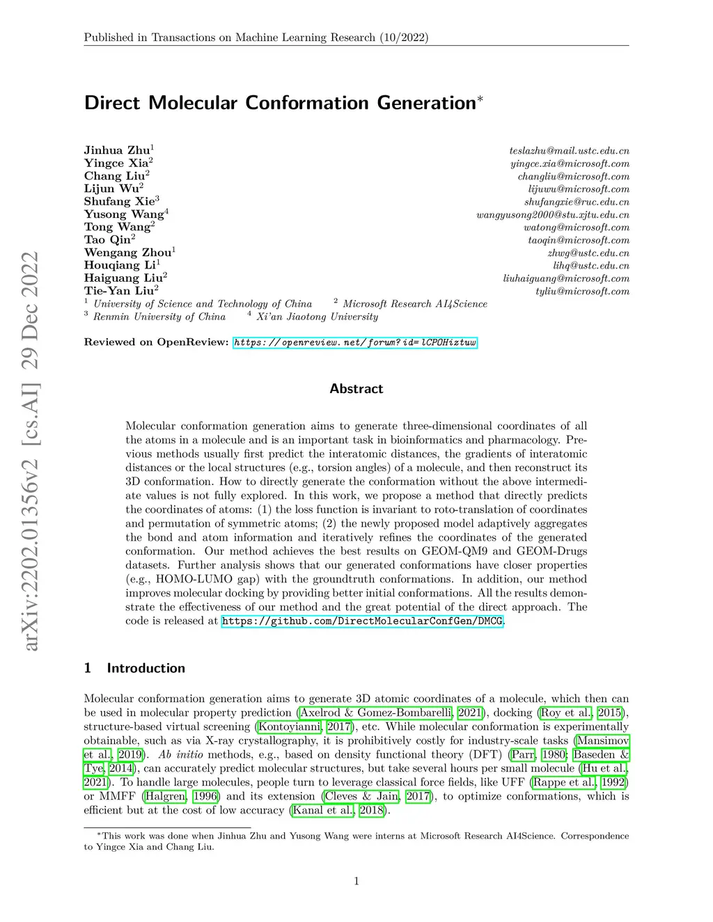 Molecular conformation generation aims to generate three-dimensional coordinates of all the atoms in a molecule and is an important task in bioinformatics and pharmacology. Previous methods usually first predict the interatomic distances, the gradients of interatomic distances or the local structures (e.g., torsion angles) of a molecule, and then reconstruct its 3D conformation. How to directly generate the conformation without the above intermediate values is not fully explored. In this work, we propose a method that directly predicts the coordinates of atoms: (1) the loss function is invariant to roto-translation of coordinates and permutation of symmetric atoms; (2) the newly proposed model adaptively aggregates the bond and atom information and iteratively refines the coordinates of the generated conformation. Our method achieves the best results on GEOM-QM9 and GEOM-Drugs datasets. Further analysis shows that our generated conformations have closer properties (e.g., HOMO-LUMO gap) with the groundtruth conformations. In addition, our method improves molecular docking by providing better initial conformations. All the results demonstrate the effectiveness of our method and the great potential of the direct approach. The code is released at https://github.com/DirectMolecularConfGen/DMCG