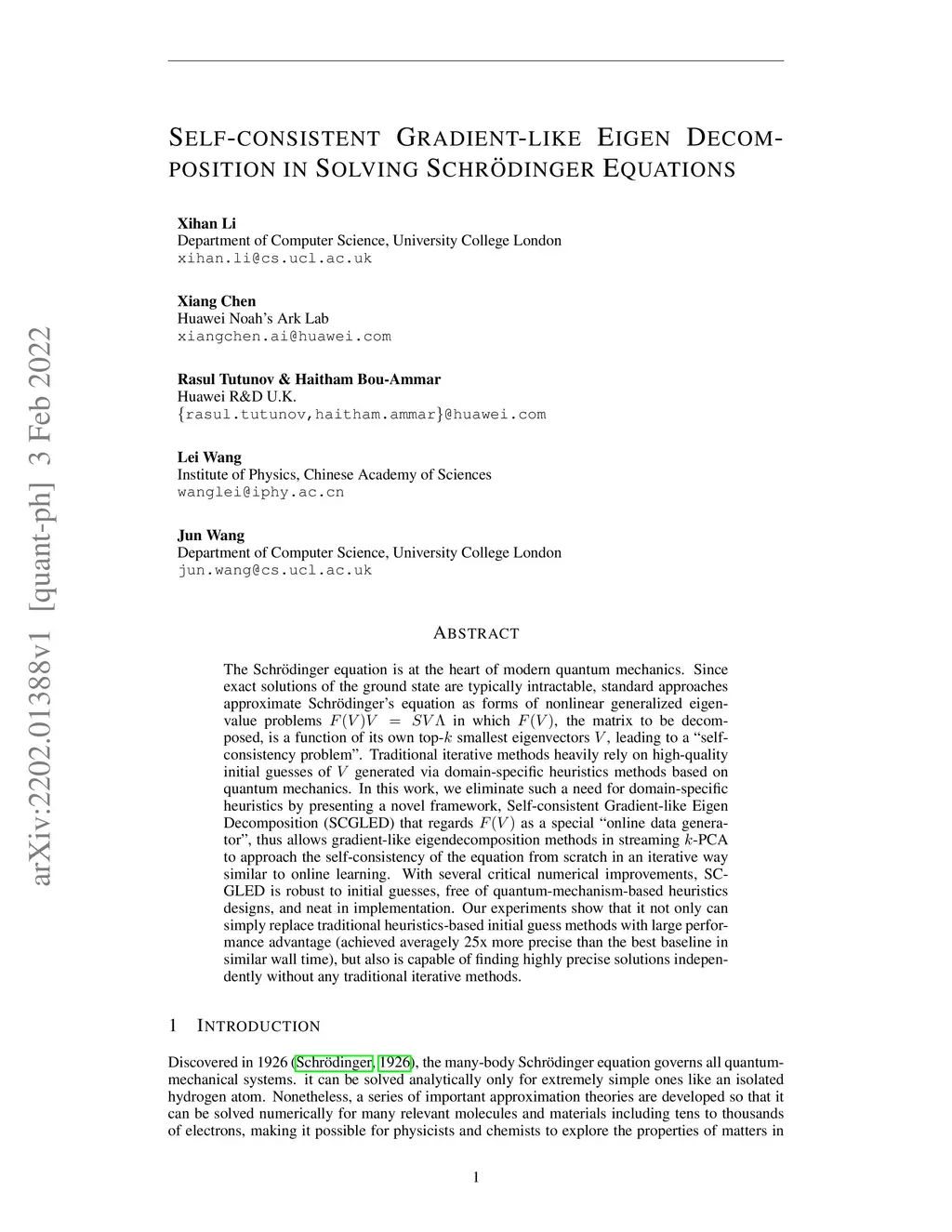 The Schr\"odinger equation is at the heart of modern quantum mechanics. Since exact solutions of the ground state are typically intractable, standard approaches approximate Schr\"odinger equation as forms of nonlinear generalized eigenvalue problems in which , the matrix to be decomposed, is a function of its own top- smallest eigenvectors , leading to a "self-consistency problem". Traditional iterative methods heavily rely on high-quality initial guesses of generated via domain-specific heuristics methods based on quantum mechanics. In this work, we eliminate such a need for domain-specific heuristics by presenting a novel framework, Self-consistent Gradient-like Eigen Decomposition (SCGLED) that regards as a special "online data generator", thus allows gradient-like eigendecomposition methods in streaming -PCA to approach the self-consistency of the equation from scratch in an iterative way similar to online learning. With several critical numerical improvements, SCGLED is robust to initial guesses, free of quantum-mechanism-based heuristics designs, and neat in implementation. Our experiments show that it not only can simply replace traditional heuristics-based initial guess methods with large performance advantage (achieved averagely 25x more precise than the best baseline in similar wall time), but also is capable of finding highly precise solutions independently without any traditional iterative methods.