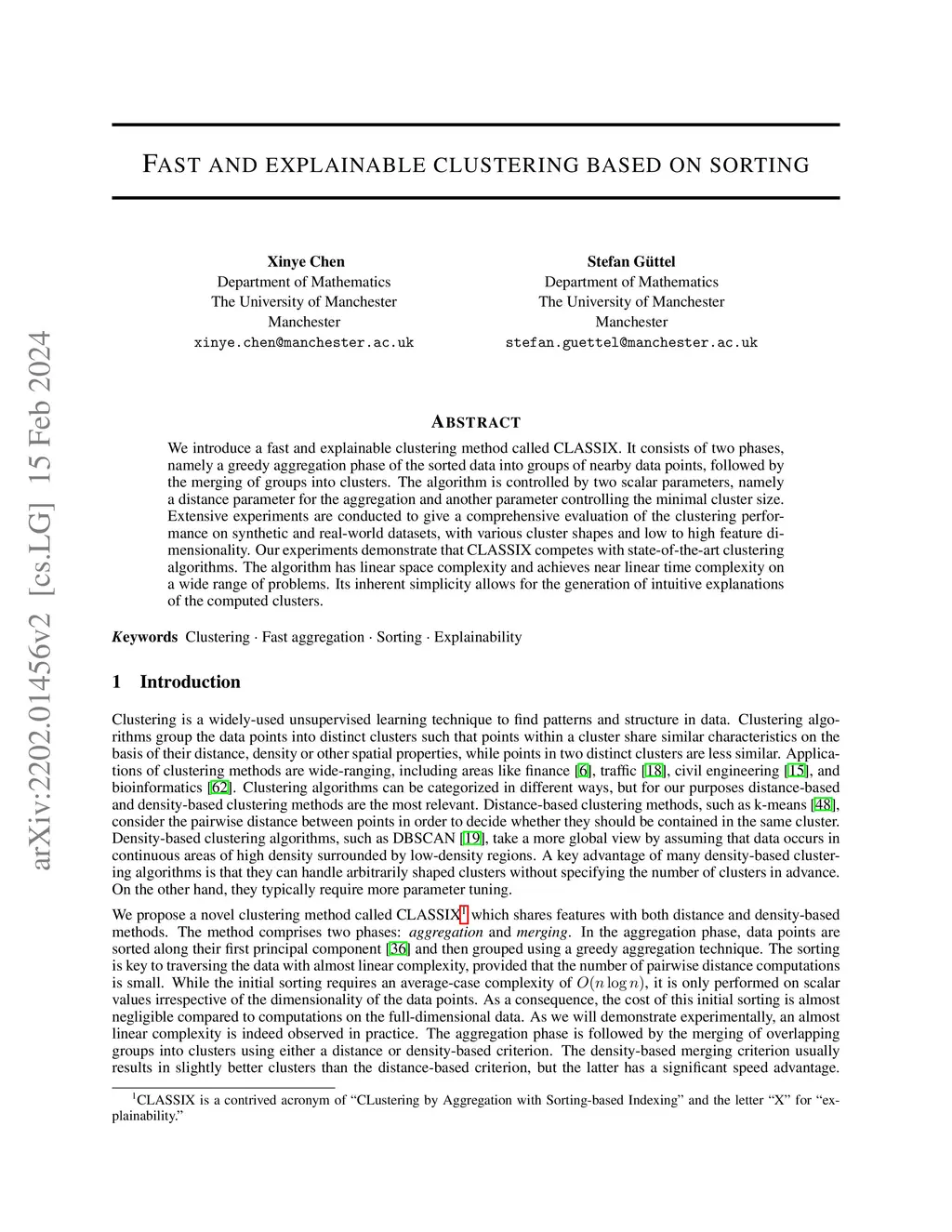 We introduce a fast and explainable clustering method called CLASSIX. It consists of two phases, namely a greedy aggregation phase of the sorted data into groups of nearby data points, followed by the merging of groups into clusters. The algorithm is controlled by two scalar parameters, namely a distance parameter for the aggregation and another parameter controlling the minimal cluster size. Extensive experiments are conducted to give a comprehensive evaluation of the clustering performance on synthetic and real-world datasets, with various cluster shapes and low to high feature dimensionality. Our experiments demonstrate that CLASSIX competes with state-of-the-art clustering algorithms. The algorithm has linear space complexity and achieves near linear time complexity on a wide range of problems. Its inherent simplicity allows for the generation of intuitive explanations of the computed clusters.