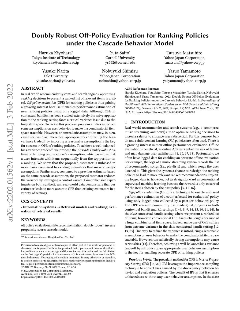 In real-world recommender systems and search engines, optimizing ranking decisions to present a ranked list of relevant items is critical. Off-policy evaluation (OPE) for ranking policies is thus gaining a growing interest because it enables performance estimation of new ranking policies using only logged data. Although OPE in contextual bandits has been studied extensively, its naive application to the ranking setting faces a critical variance issue due to the huge item space. To tackle this problem, previous studies introduce some assumptions on user behavior to make the combinatorial item space tractable. However, an unrealistic assumption may, in turn, cause serious bias. Therefore, appropriately controlling the bias-variance tradeoff by imposing a reasonable assumption is the key for success in OPE of ranking policies. To achieve a well-balanced bias-variance tradeoff, we propose the Cascade Doubly Robust estimator building on the cascade assumption, which assumes that a user interacts with items sequentially from the top position in a ranking. We show that the proposed estimator is unbiased in more cases compared to existing estimators that make stronger assumptions. Furthermore, compared to a previous estimator based on the same cascade assumption, the proposed estimator reduces the variance by leveraging a control variate. Comprehensive experiments on both synthetic and real-world data demonstrate that our estimator leads to more accurate OPE than existing estimators in a variety of settings.
