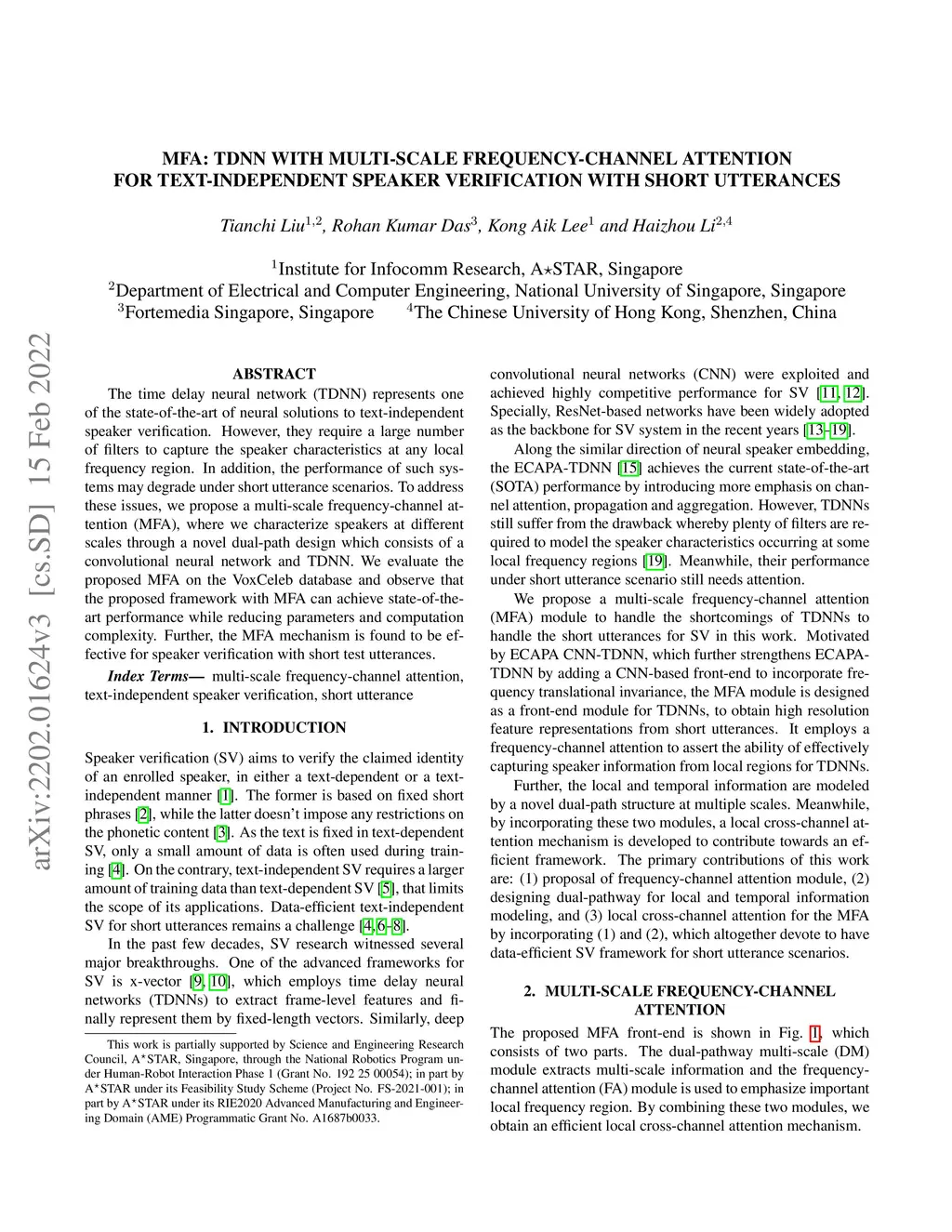 The time delay neural network (TDNN) represents one of the state-of-the-art of neural solutions to text-independent speaker verification. However, they require a large number of filters to capture the speaker characteristics at any local frequency region. In addition, the performance of such systems may degrade under short utterance scenarios. To address these issues, we propose a multi-scale frequency-channel attention (MFA), where we characterize speakers at different scales through a novel dual-path design which consists of a convolutional neural network and TDNN. We evaluate the proposed MFA on the VoxCeleb database and observe that the proposed framework with MFA can achieve state-of-the-art performance while reducing parameters and computation complexity. Further, the MFA mechanism is found to be effective for speaker verification with short test utterances.