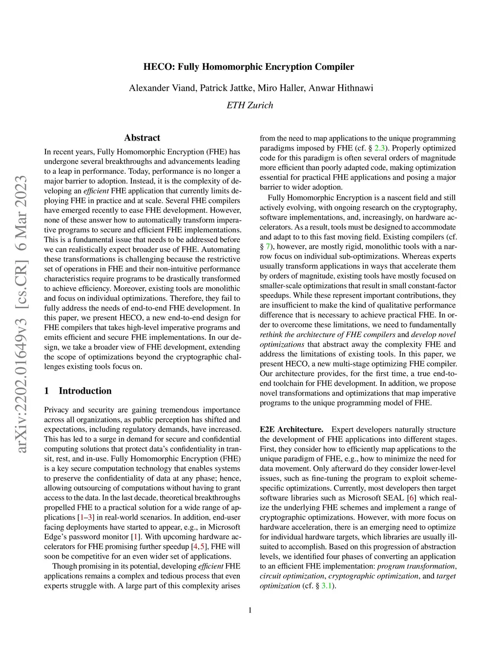 In recent years, Fully Homomorphic Encryption (FHE) has undergone several breakthroughs and advancements, leading to a leap in performance. Today, performance is no longer a major barrier to adoption. Instead, it is the complexity of developing an efficient FHE application that currently limits deploying FHE in practice and at scale. Several FHE compilers have emerged recently to ease FHE development. However, none of these answer how to automatically transform imperative programs to secure and efficient FHE implementations. This is a fundamental issue that needs to be addressed before we can realistically expect broader use of FHE. Automating these transformations is challenging because the restrictive set of operations in FHE and their non-intuitive performance characteristics require programs to be drastically transformed to achieve efficiency. Moreover, existing tools are monolithic and focus on individual optimizations. Therefore, they fail to fully address the needs of end-to-end FHE development. In this paper, we present HECO, a new end-to-end design for FHE compilers that takes high-level imperative programs and emits efficient and secure FHE implementations. In our design, we take a broader view of FHE development, extending the scope of optimizations beyond the cryptographic challenges existing tools focus on.