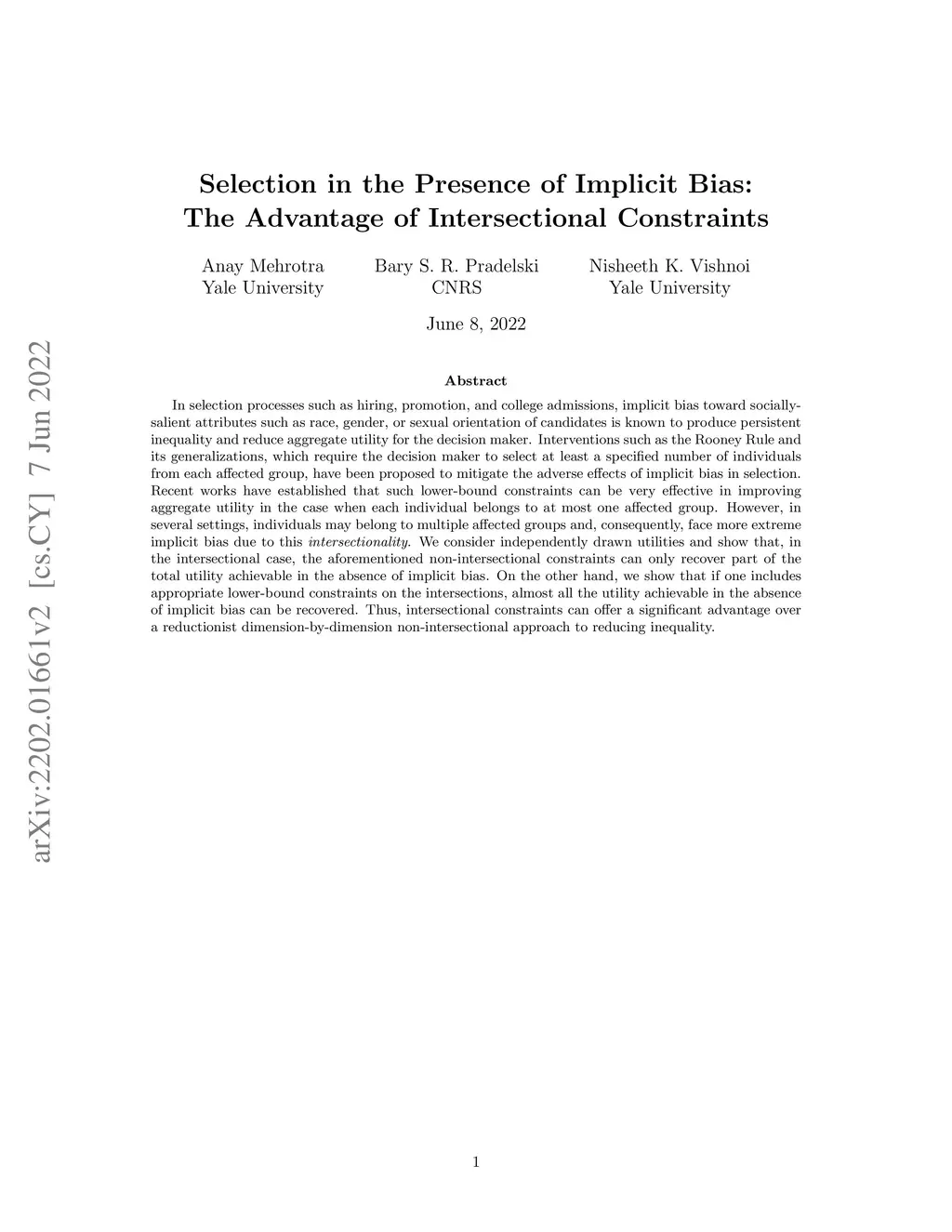 In selection processes such as hiring, promotion, and college admissions, implicit bias toward socially-salient attributes such as race, gender, or sexual orientation of candidates is known to produce persistent inequality and reduce aggregate utility for the decision maker. Interventions such as the Rooney Rule and its generalizations, which require the decision maker to select at least a specified number of individuals from each affected group, have been proposed to mitigate the adverse effects of implicit bias in selection. Recent works have established that such lower-bound constraints can be very effective in improving aggregate utility in the case when each individual belongs to at most one affected group. However, in several settings, individuals may belong to multiple affected groups and, consequently, face more extreme implicit bias due to this intersectionality. We consider independently drawn utilities and show that, in the intersectional case, the aforementioned non-intersectional constraints can only recover part of the total utility achievable in the absence of implicit bias. On the other hand, we show that if one includes appropriate lower-bound constraints on the intersections, almost all the utility achievable in the absence of implicit bias can be recovered. Thus, intersectional constraints can offer a significant advantage over a reductionist dimension-by-dimension non-intersectional approach to reducing inequality.