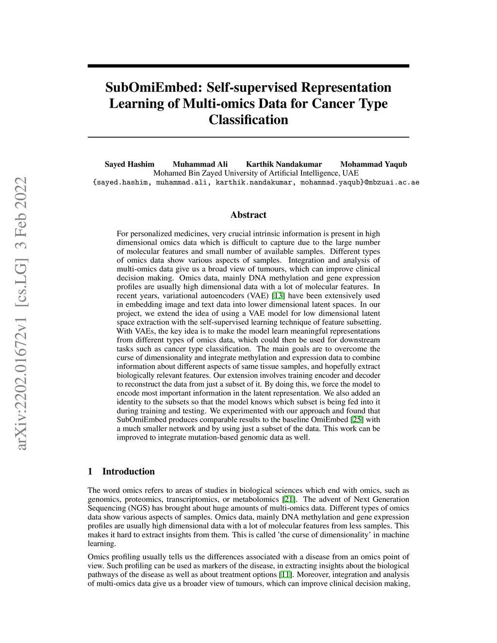 For personalized medicines, very crucial intrinsic information is present in high dimensional omics data which is difficult to capture due to the large number of molecular features and small number of available samples. Different types of omics data show various aspects of samples. Integration and analysis of multi-omics data give us a broad view of tumours, which can improve clinical decision making. Omics data, mainly DNA methylation and gene expression profiles are usually high dimensional data with a lot of molecular features. In recent years, variational autoencoders (VAE) have been extensively used in embedding image and text data into lower dimensional latent spaces. In our project, we extend the idea of using a VAE model for low dimensional latent space extraction with the self-supervised learning technique of feature subsetting. With VAEs, the key idea is to make the model learn meaningful representations from different types of omics data, which could then be used for downstream tasks such as cancer type classification. The main goals are to overcome the curse of dimensionality and integrate methylation and expression data to combine information about different aspects of same tissue samples, and hopefully extract biologically relevant features. Our extension involves training encoder and decoder to reconstruct the data from just a subset of it. By doing this, we force the model to encode most important information in the latent representation. We also added an identity to the subsets so that the model knows which subset is being fed into it during training and testing. We experimented with our approach and found that SubOmiEmbed produces comparable results to the baseline OmiEmbed with a much smaller network and by using just a subset of the data. This work can be improved to integrate mutation-based genomic data as well.