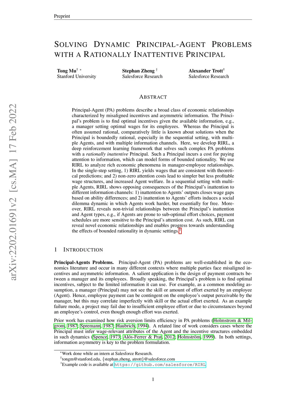 Principal-Agent (PA) problems describe a broad class of economic relationships characterized by misaligned incentives and asymmetric information. The Principal's problem is to find optimal incentives given the available information, e.g., a manager setting optimal wages for its employees. Whereas the Principal is often assumed rational, comparatively little is known about solutions when the Principal is boundedly rational, especially in the sequential setting, with multiple Agents, and with multiple information channels. Here, we develop RIRL, a deep reinforcement learning framework that solves such complex PA problems with a rationally inattentive Principal. Such a Principal incurs a cost for paying attention to information, which can model forms of bounded rationality. We use RIRL to analyze rich economic phenomena in manager-employee relationships. In the single-step setting, 1) RIRL yields wages that are consistent with theoretical predictions; and 2) non-zero attention costs lead to simpler but less profitable wage structures, and increased Agent welfare. In a sequential setting with multiple Agents, RIRL shows opposing consequences of the Principal's inattention to different information channels: 1) inattention to Agents' outputs closes wage gaps based on ability differences; and 2) inattention to Agents' efforts induces a social dilemma dynamic in which Agents work harder, but essentially for free. Moreover, RIRL reveals non-trivial relationships between the Principal's inattention and Agent types, e.g., if Agents are prone to sub-optimal effort choices, payment schedules are more sensitive to the Principal's attention cost. As such, RIRL can reveal novel economic relationships and enables progress towards understanding the effects of bounded rationality in dynamic settings.