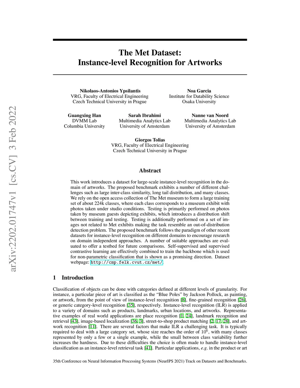 This work introduces a dataset for large-scale instance-level recognition in the domain of artworks. The proposed benchmark exhibits a number of different challenges such as large inter-class similarity, long tail distribution, and many classes. We rely on the open access collection of The Met museum to form a large training set of about 224k classes, where each class corresponds to a museum exhibit with photos taken under studio conditions. Testing is primarily performed on photos taken by museum guests depicting exhibits, which introduces a distribution shift between training and testing. Testing is additionally performed on a set of images not related to Met exhibits making the task resemble an out-of-distribution detection problem. The proposed benchmark follows the paradigm of other recent datasets for instance-level recognition on different domains to encourage research on domain independent approaches. A number of suitable approaches are evaluated to offer a testbed for future comparisons. Self-supervised and supervised contrastive learning are effectively combined to train the backbone which is used for non-parametric classification that is shown as a promising direction. Dataset webpage: http://cmp.felk.cvut.cz/met/