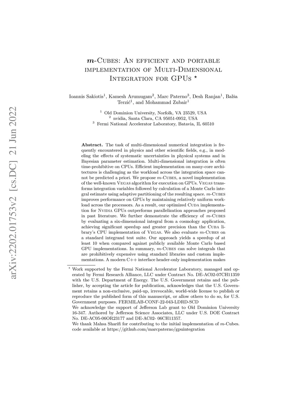 The task of multi-dimensional numerical integration is frequently encountered in physics and other scientific fields, e.g., in modeling the effects of systematic uncertainties in physical systems and in Bayesian parameter estimation. Multi-dimensional integration is often time-prohibitive on CPUs. Efficient implementation on many-core architectures is challenging as the workload across the integration space cannot be predicted a priori. We propose m-Cubes, a novel implementation of the well-known Vegas algorithm for execution on GPUs. Vegas transforms integration variables followed by calculation of a Monte Carlo integral estimate using adaptive partitioning of the resulting space. m-Cubes improves performance on GPUs by maintaining relatively uniform workload across the processors. As a result, our optimized Cuda implementation for Nvidia GPUs outperforms parallelization approaches proposed in past literature. We further demonstrate the efficiency of m-Cubes by evaluating a six-dimensional integral from a cosmology application, achieving significant speedup and greater precision than the CUBA library's CPU implementation of VEGAS. We also evaluate m-Cubes on a standard integrand test suite. m-Cubes outperforms the serial implementations of the Cuba and GSL libraries by orders of magnitude speedup while maintaining comparable accuracy. Our approach yields a speedup of at least 10 when compared against publicly available Monte Carlo based GPU implementations. In summary, m-Cubes can solve integrals that are prohibitively expensive using standard libraries and custom implementations. A modern C++ interface header-only implementation makes m-Cubes portable, allowing its utilization in complicated pipelines with easy to define stateful integrals. Compatibility with non-Nvidia GPUs is achieved with our initial implementation of m-Cubes using the Kokkos framework.