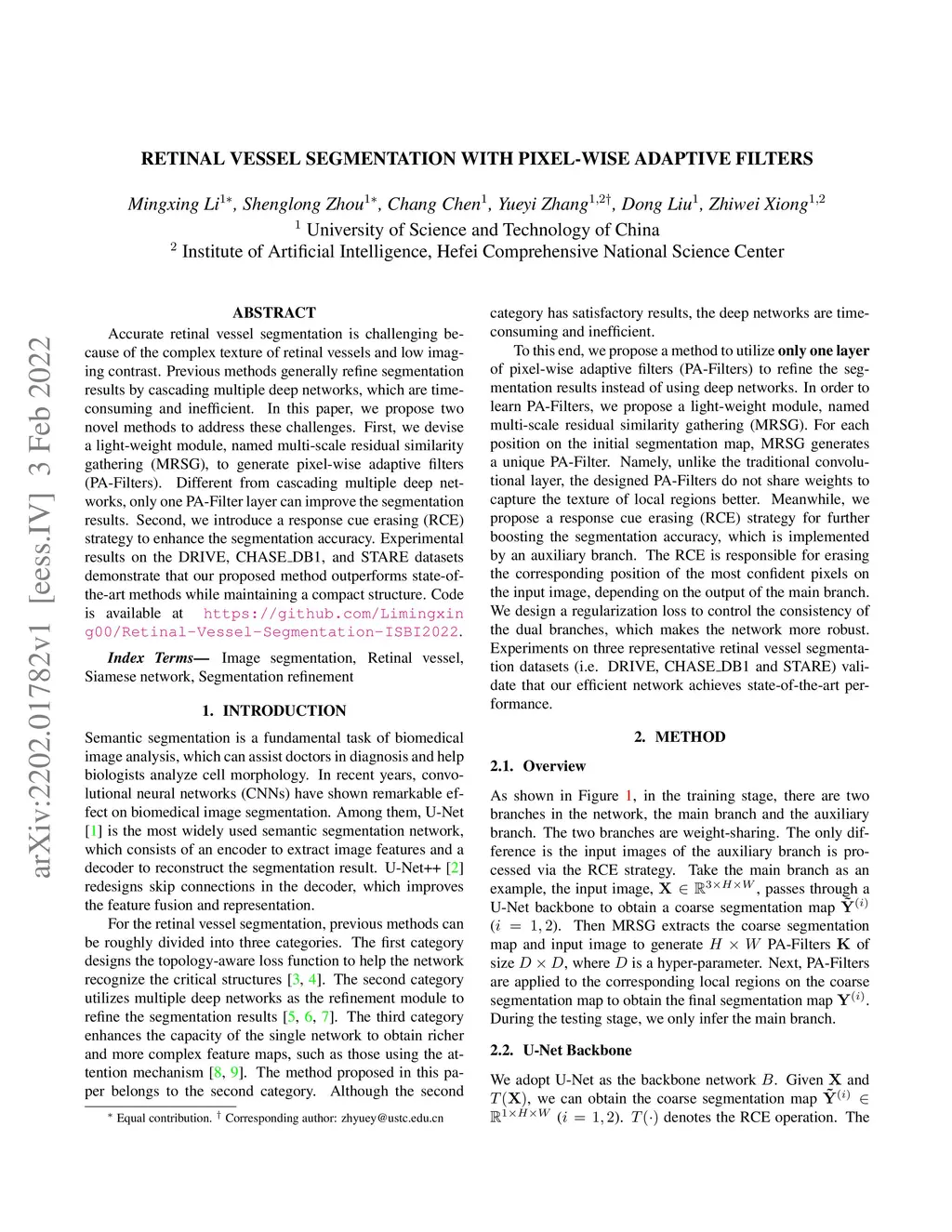 Accurate retinal vessel segmentation is challenging because of the complex texture of retinal vessels and low imaging contrast. Previous methods generally refine segmentation results by cascading multiple deep networks, which are time-consuming and inefficient. In this paper, we propose two novel methods to address these challenges. First, we devise a light-weight module, named multi-scale residual similarity gathering (MRSG), to generate pixel-wise adaptive filters (PA-Filters). Different from cascading multiple deep networks, only one PA-Filter layer can improve the segmentation results. Second, we introduce a response cue erasing (RCE) strategy to enhance the segmentation accuracy. Experimental results on the DRIVE, CHASE_DB1, and STARE datasets demonstrate that our proposed method outperforms state-of-the-art methods while maintaining a compact structure. Code is available at https://github.com/Limingxing00/Retinal-Vessel-Segmentation-ISBI20222.