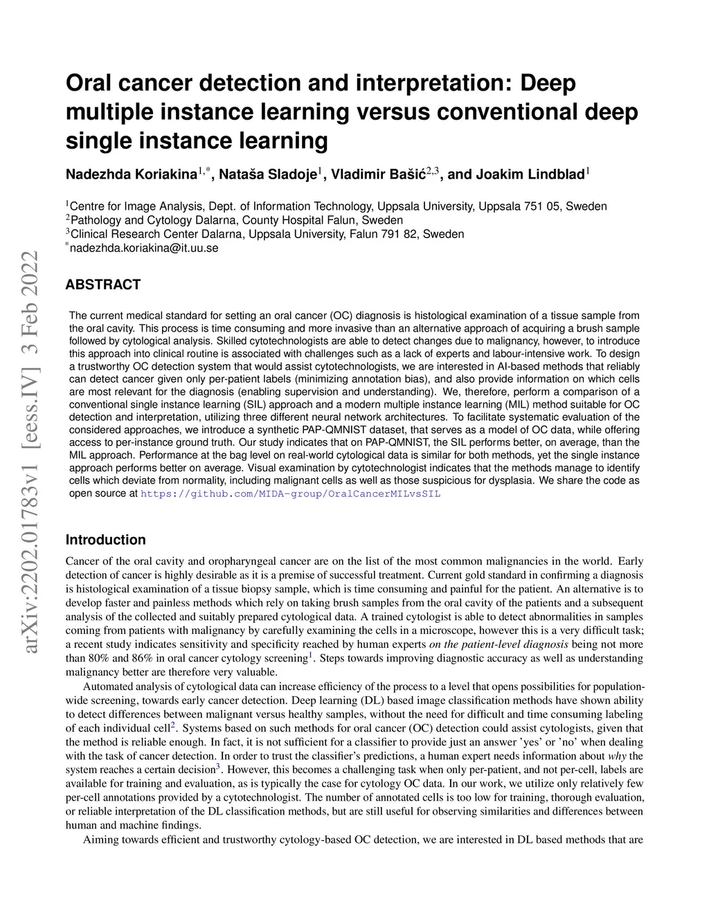 The current medical standard for setting an oral cancer (OC) diagnosis is histological examination of a tissue sample from the oral cavity. This process is time consuming and more invasive than an alternative approach of acquiring a brush sample followed by cytological analysis. Skilled cytotechnologists are able to detect changes due to malignancy, however, to introduce this approach into clinical routine is associated with challenges such as a lack of experts and labour-intensive work. To design a trustworthy OC detection system that would assist cytotechnologists, we are interested in AI-based methods that reliably can detect cancer given only per-patient labels (minimizing annotation bias), and also provide information on which cells are most relevant for the diagnosis (enabling supervision and understanding). We, therefore, perform a comparison of a conventional single instance learning (SIL) approach and a modern multiple instance learning (MIL) method suitable for OC detection and interpretation, utilizing three different neural network architectures. To facilitate systematic evaluation of the considered approaches, we introduce a synthetic PAP-QMNIST dataset, that serves as a model of OC data, while offering access to per-instance ground truth. Our study indicates that on PAP-QMNIST, the SIL performs better, on average, than the MIL approach. Performance at the bag level on real-world cytological data is similar for both methods, yet the single instance approach performs better on average. Visual examination by cytotechnologist indicates that the methods manage to identify cells which deviate from normality, including malignant cells as well as those suspicious for dysplasia. We share the code as open source at https://github.com/MIDA-group/OralCancerMILvsSIL