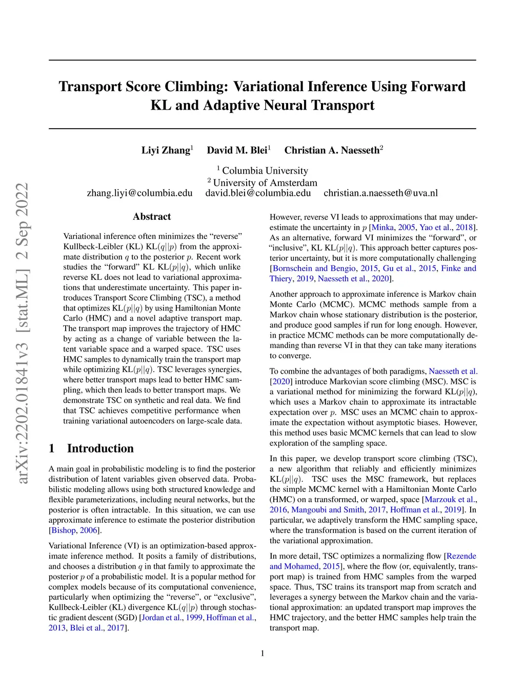 Variational inference often minimizes the "reverse" Kullbeck-Leibler (KL) KL(q||p) from the approximate distribution q to the posterior p. Recent work studies the "forward" KL KL(p||q), which unlike reverse KL does not lead to variational approximations that underestimate uncertainty. This paper introduces Transport Score Climbing (TSC), a method that optimizes KL(p||q) by using Hamiltonian Monte Carlo (HMC) and a novel adaptive transport map. The transport map improves the trajectory of HMC by acting as a change of variable between the latent variable space and a warped space. TSC uses HMC samples to dynamically train the transport map while optimizing KL(p||q). TSC leverages synergies, where better transport maps lead to better HMC sampling, which then leads to better transport maps. We demonstrate TSC on synthetic and real data. We find that TSC achieves competitive performance when training variational autoencoders on large-scale data.