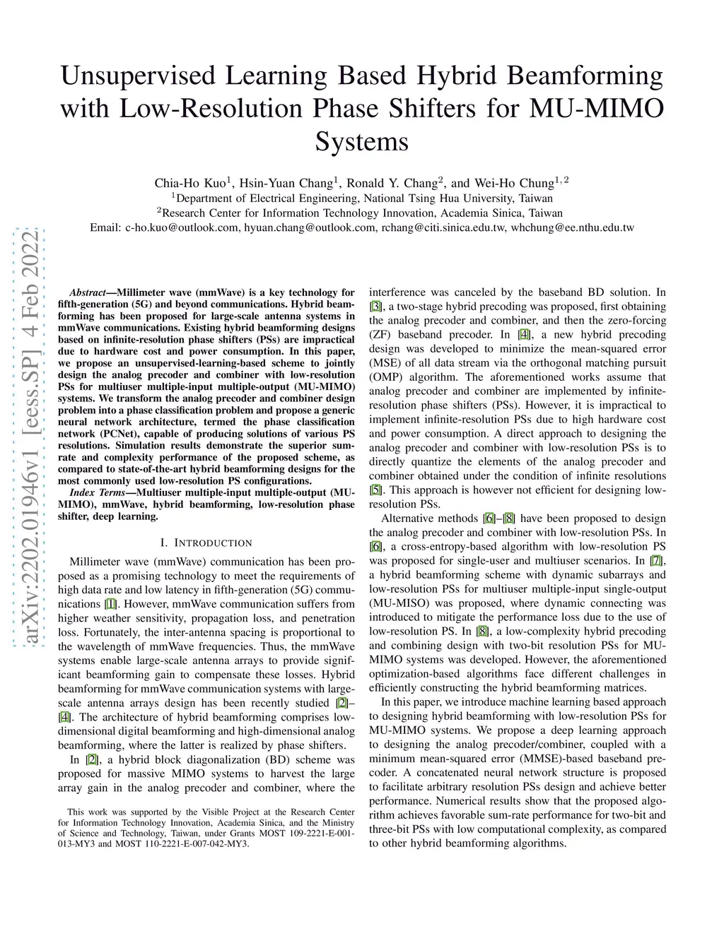 Millimeter wave (mmWave) is a key technology for fifth-generation (5G) and beyond communications. Hybrid beamforming has been proposed for large-scale antenna systems in mmWave communications. Existing hybrid beamforming designs based on infinite-resolution phase shifters (PSs) are impractical due to hardware cost and power consumption. In this paper, we propose an unsupervised-learning-based scheme to jointly design the analog precoder and combiner with low-resolution PSs for multiuser multiple-input multiple-output (MU-MIMO) systems. We transform the analog precoder and combiner design problem into a phase classification problem and propose a generic neural network architecture, termed the phase classification network (PCNet), capable of producing solutions of various PS resolutions. Simulation results demonstrate the superior sum-rate and complexity performance of the proposed scheme, as compared to state-of-the-art hybrid beamforming designs for the most commonly used low-resolution PS configurations.