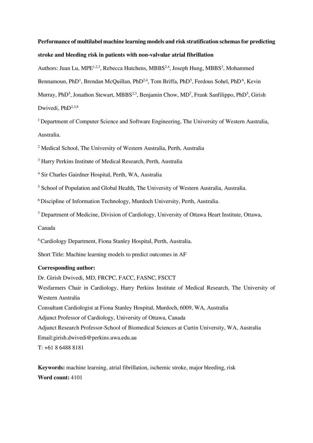 Appropriate antithrombotic therapy for patients with atrial fibrillation (AF) requires assessment of ischemic stroke and bleeding risks. However, risk stratification schemas such as CHA2DS2-VASc and HAS-BLED have modest predictive capacity for patients with AF. Machine learning (ML) techniques may improve predictive performance and support decision-making for appropriate antithrombotic therapy. We compared the performance of multilabel ML models with the currently used risk scores for predicting outcomes in AF patients. Materials and Methods This was a retrospective cohort study of 9670 patients, mean age 76.9 years, 46% women, who were hospitalized with non-valvular AF, and had 1-year follow-up. The primary outcome was ischemic stroke and major bleeding admission. The secondary outcomes were all-cause death and event-free survival. The discriminant power of ML models was compared with clinical risk scores by the area under the curve (AUC). Risk stratification was assessed using the net reclassification index. Results Multilabel gradient boosting machine provided the best discriminant power for stroke, major bleeding, and death (AUC = 0.685, 0.709, and 0.765 respectively) compared to other ML models. It provided modest performance improvement for stroke compared to CHA2DS2-VASc (AUC = 0.652), but significantly improved major bleeding prediction compared to HAS-BLED (AUC = 0.522). It also had a much greater discriminant power for death compared with CHA2DS2-VASc (AUC = 0.606). Also, models identified additional risk features (such as hemoglobin level, renal function, etc.) for each outcome. Conclusions Multilabel ML models can outperform clinical risk stratification scores for predicting the risk of major bleeding and death in non-valvular AF patients.