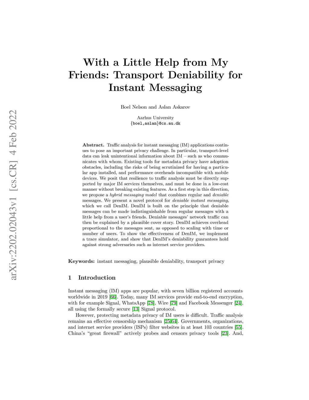 Traffic analysis for instant messaging (IM) applications continues to pose an important privacy challenge. In particular, transport-level data can leak unintentional information about IM -- such as who communicates with whom. Existing tools for metadata privacy have adoption obstacles, including the risks of being scrutinized for having a particular app installed, and performance overheads incompatible with mobile devices. We posit that resilience to traffic analysis must be directly supported by major IM services themselves, and must be done in a low-cost manner without breaking existing features. As a first step in this direction, we propose a hybrid messaging model that combines regular and deniable messages. We present a novel protocol for deniable instant messaging, which we call DenIM. DenIM is built on the principle that deniable messages can be made indistinguishable from regular messages with a little help from a user's friends. Deniable messages' network traffic can then be explained by a plausible cover story. DenIM achieves overhead proportional to the messages sent, as opposed to scaling with time or number of users. To show the effectiveness of DenIM, we implement a trace simulator, and show that DenIM's deniability guarantees hold against strong adversaries such as internet service providers.