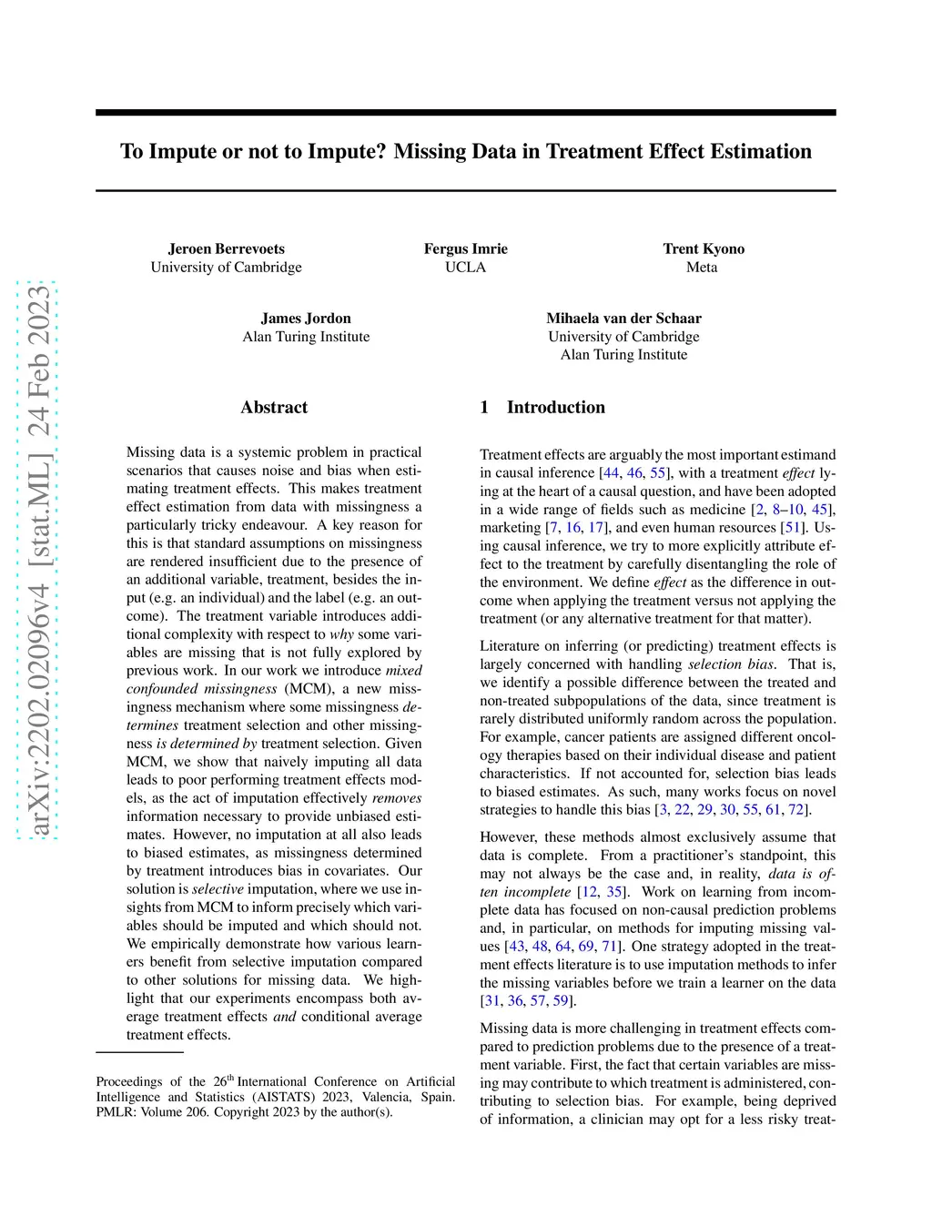 Missing data is a systemic problem in practical scenarios that causes noise and bias when estimating treatment effects. This makes treatment effect estimation from data with missingness a particularly tricky endeavour. A key reason for this is that standard assumptions on missingness are rendered insufficient due to the presence of an additional variable, treatment, besides the individual and the outcome. Having a treatment variable introduces additional complexity with respect to why some variables are missing that is not fully explored by previous work. In our work we identify a new missingness mechanism, which we term mixed confounded missingness (MCM), where some missingness determines treatment selection and other missingness is determined by treatment selection. Given MCM, we show that naively imputing all data leads to poor performing treatment effects models, as the act of imputation effectively removes information necessary to provide unbiased estimates. However, no imputation at all also leads to biased estimates, as missingness determined by treatment divides the population in distinct subpopulations, where estimates across these populations will be biased. Our solution is selective imputation, where we use insights from MCM to inform precisely which variables should be imputed and which should not. We empirically demonstrate how various learners benefit from selective imputation compared to other solutions for missing data.