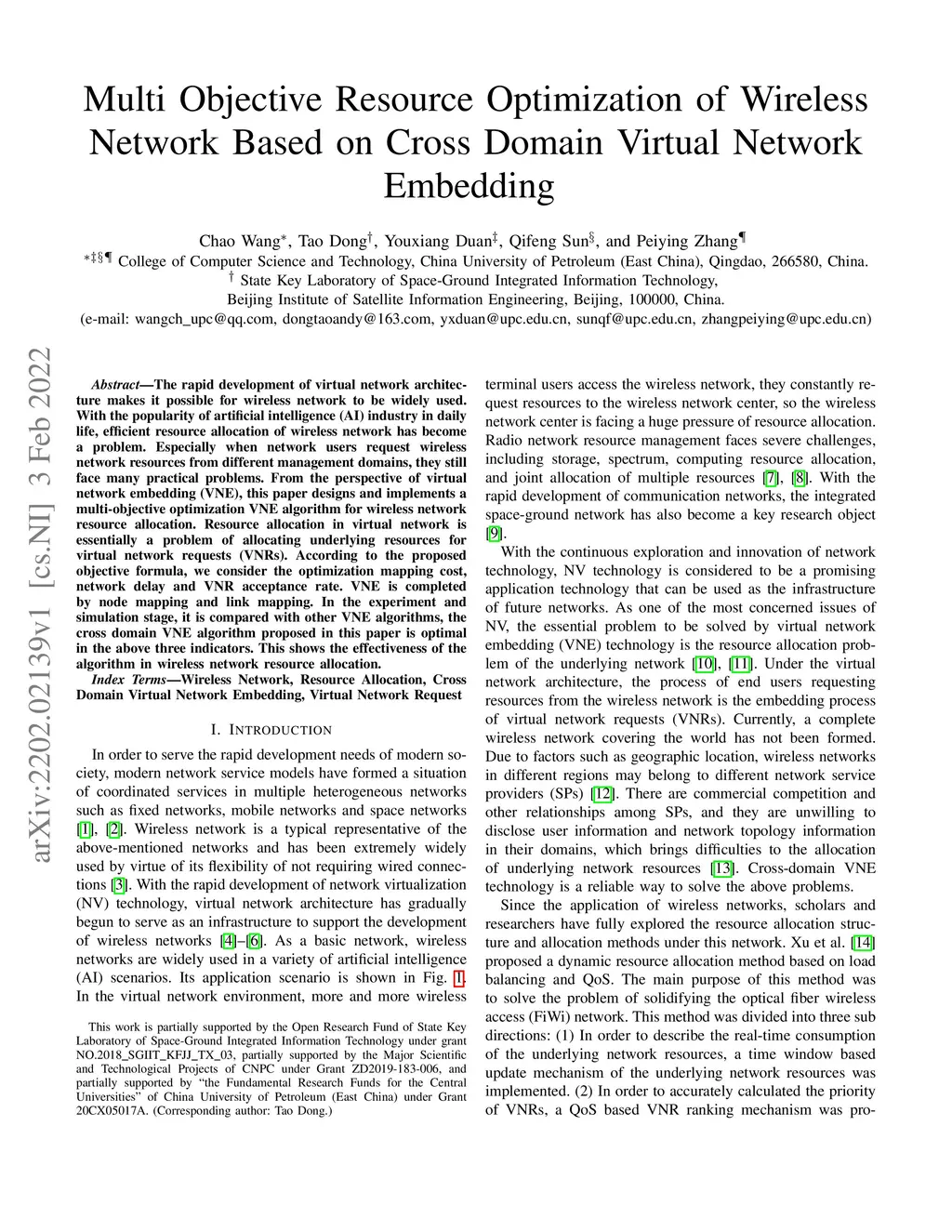The rapid development of virtual network architecture makes it possible for wireless network to be widely used. With the popularity of artificial intelligence (AI) industry in daily life, efficient resource allocation of wireless network has become a problem. Especially when network users request wireless network resources from different management domains, they still face many practical problems. From the perspective of virtual network embedding (VNE), this paper designs and implements a multi-objective optimization VNE algorithm for wireless network resource allocation. Resource allocation in virtual network is essentially a problem of allocating underlying resources for virtual network requests (VNRs). According to the proposed objective formula, we consider the optimization mapping cost, network delay and VNR acceptance rate. VNE is completed by node mapping and link mapping. In the experiment and simulation stage, it is compared with other VNE algorithms, the cross domain VNE algorithm proposed in this paper is optimal in the above three indicators. This shows the effectiveness of the algorithm in wireless network resource allocation.