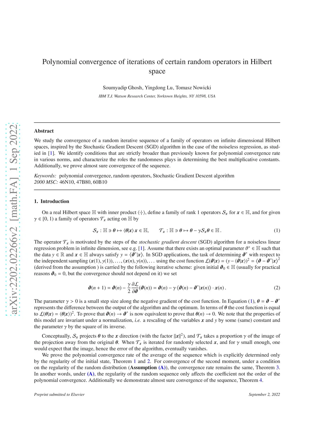 We study the convergence of a random iterative sequence of a family of operators on infinite dimensional Hilbert spaces, inspired by the Stochastic Gradient Descent (SGD) algorithm in the case of the noiseless regression, as studied in [1]. We identify conditions that are strictly broader than previously known for polynomial convergence rate in various norms, and characterize the roles the randomness plays in determining the best multiplicative constants. Additionally, we prove almost sure convergence of the sequence.