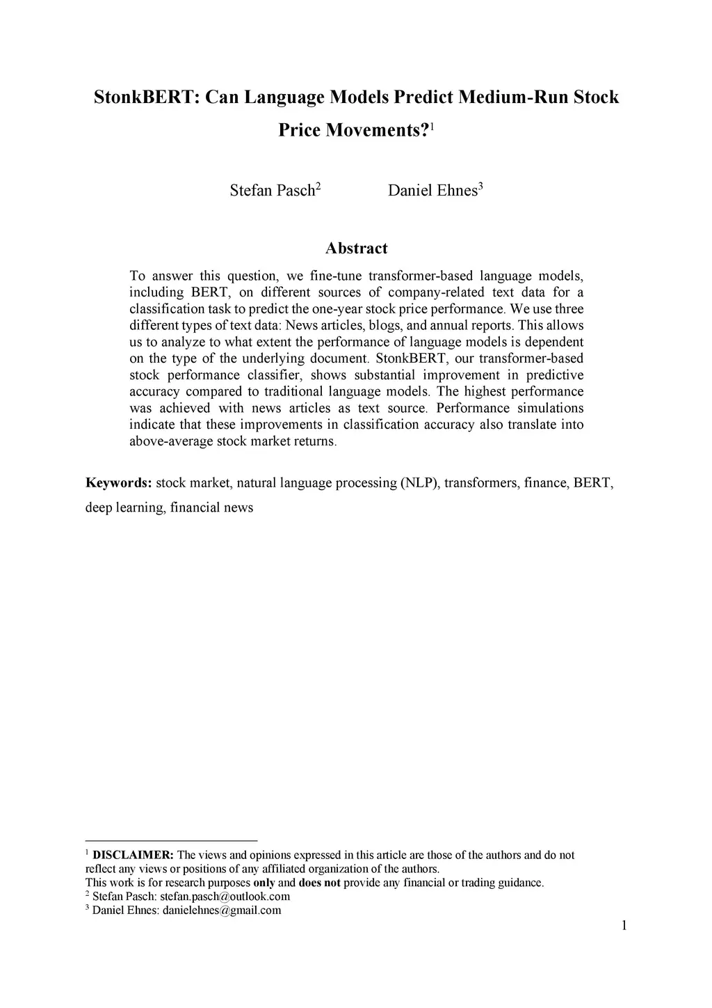 To answer this question, we fine-tune transformer-based language models, including BERT, on different sources of company-related text data for a classification task to predict the one-year stock price performance. We use three different types of text data: News articles, blogs, and annual reports. This allows us to analyze to what extent the performance of language models is dependent on the type of the underlying document. StonkBERT, our transformer-based stock performance classifier, shows substantial improvement in predictive accuracy compared to traditional language models. The highest performance was achieved with news articles as text source. Performance simulations indicate that these improvements in classification accuracy also translate into above-average stock market returns.
