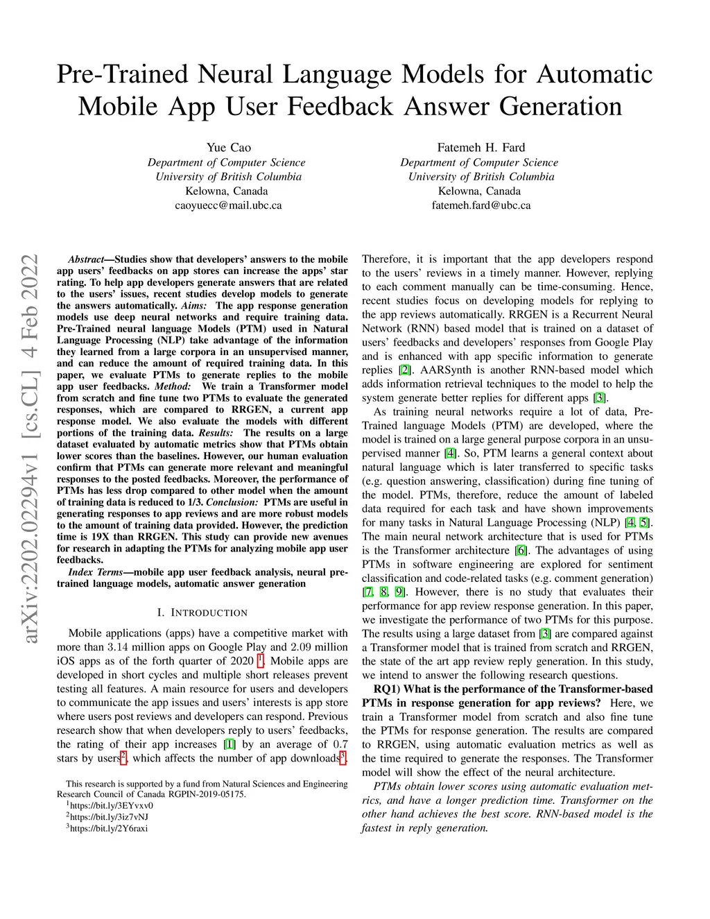 Studies show that developers' answers to the mobile app users' feedbacks on app stores can increase the apps' star rating. To help app developers generate answers that are related to the users' issues, recent studies develop models to generate the answers automatically. Aims: The app response generation models use deep neural networks and require training data. Pre-Trained neural language Models (PTM) used in Natural Language Processing (NLP) take advantage of the information they learned from a large corpora in an unsupervised manner, and can reduce the amount of required training data. In this paper, we evaluate PTMs to generate replies to the mobile app user feedbacks. Method: We train a Transformer model from scratch and fine-tune two PTMs to evaluate the generated responses, which are compared to RRGEN, a current app response model. We also evaluate the models with different portions of the training data. Results: The results on a large dataset evaluated by automatic metrics show that PTMs obtain lower scores than the baselines. However, our human evaluation confirms that PTMs can generate more relevant and meaningful responses to the posted feedbacks. Moreover, the performance of PTMs has less drop compared to other models when the amount of training data is reduced to 1/3. Conclusion: PTMs are useful in generating responses to app reviews and are more robust models to the amount of training data provided. However, the prediction time is 19X than RRGEN. This study can provide new avenues for research in adapting the PTMs for analyzing mobile app user feedbacks. Index Terms-mobile app user feedback analysis, neural pre-trained language models, automatic answer generation