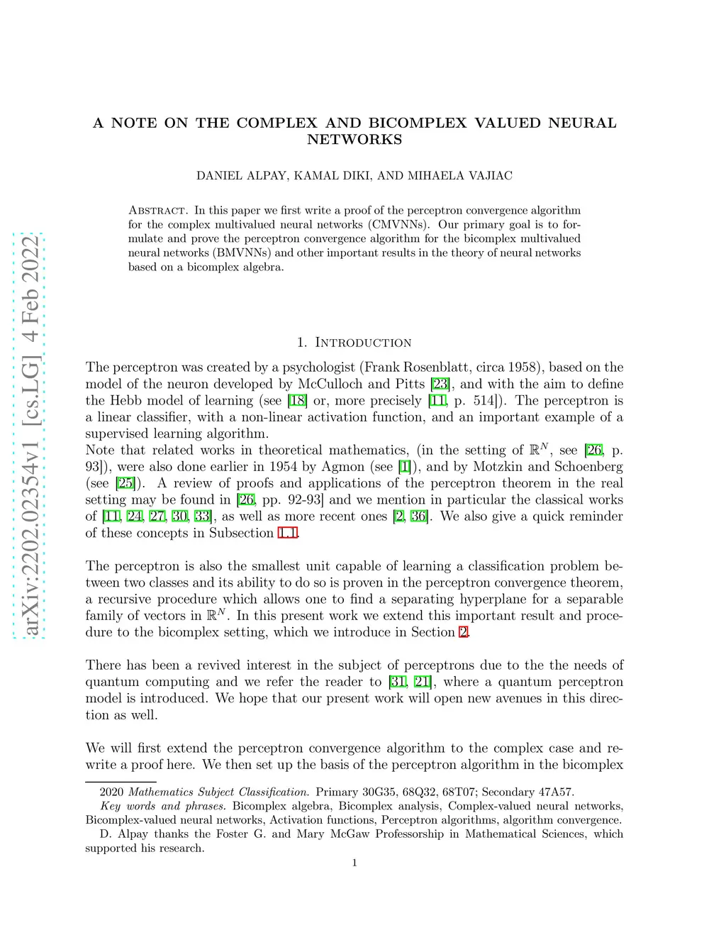 In this paper we first write a proof of the perceptron convergence algorithm for the complex multivalued neural networks (CMVNNs). Our primary goal is to formulate and prove the perceptron convergence algorithm for the bicomplex multivalued neural networks (BMVNNs) and other important results in the theory of neural networks based on a bicomplex algebra.