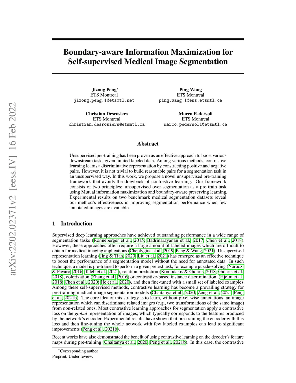Unsupervised pre-training has been proven as an effective approach to boost various downstream tasks given limited labeled data. Among various methods, contrastive learning learns a discriminative representation by constructing positive and negative pairs. However, it is not trivial to build reasonable pairs for a segmentation task in an unsupervised way. In this work, we propose a novel unsupervised pre-training framework that avoids the drawback of contrastive learning. Our framework consists of two principles: unsupervised over-segmentation as a pre-train task using mutual information maximization and boundary-aware preserving learning. Experimental results on two benchmark medical segmentation datasets reveal our method's effectiveness in improving segmentation performance when few annotated images are available.