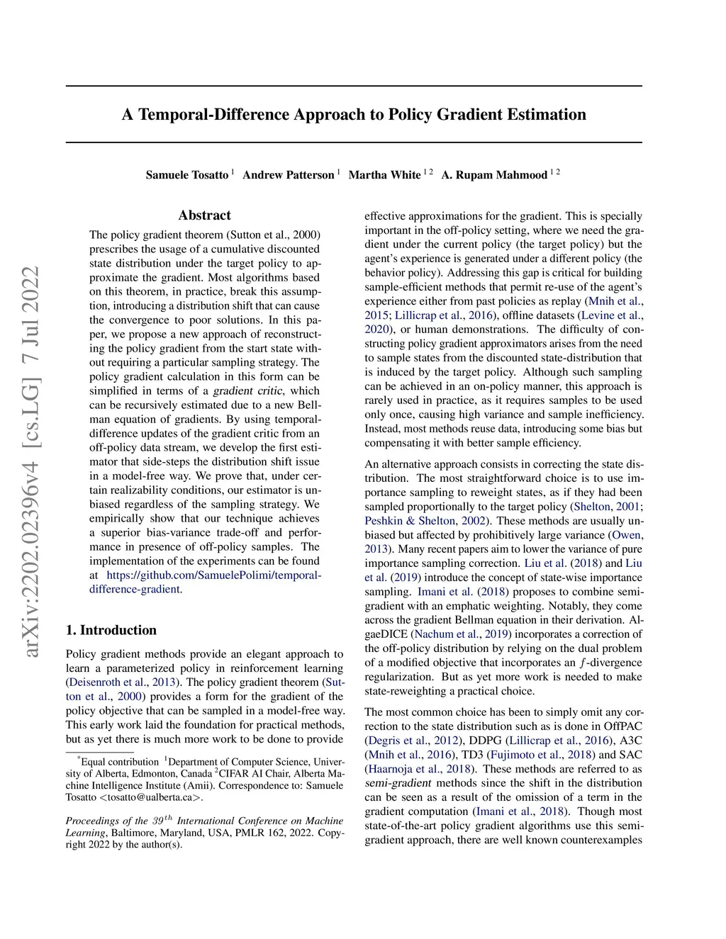 A Temporal-Difference Approach to Policy Gradient Estimation
