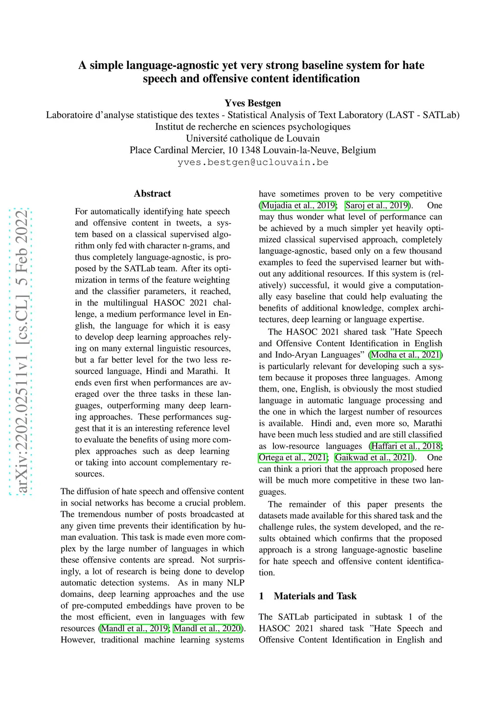 For automatically identifying hate speech and offensive content in tweets, a system based on a classical supervised algorithm only fed with character n-grams, and thus completely language-agnostic, is proposed by the SATLab team. After its optimization in terms of the feature weighting and the classifier parameters, it reached, in the multilingual HASOC 2021 challenge, a medium performance level in English, the language for which it is easy to develop deep learning approaches relying on many external linguistic resources, but a far better level for the two less resourced language, Hindi and Marathi. It ends even first when performances are averaged over the three tasks in these languages, outperforming many deep learning approaches. These performances suggest that it is an interesting reference level to evaluate the benefits of using more complex approaches such as deep learning or taking into account complementary resources.