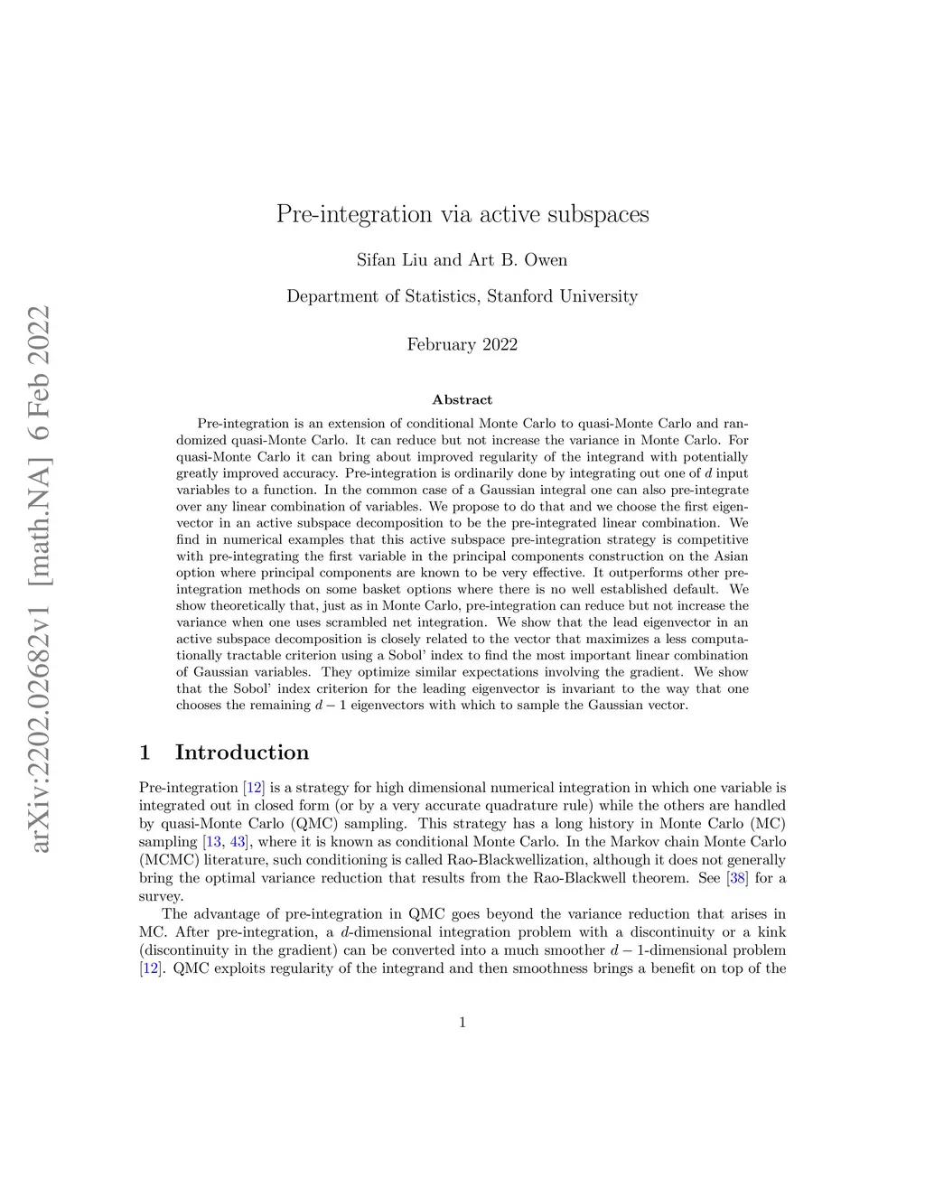 Pre-integration is an extension of conditional Monte Carlo to quasi-Monte Carlo and randomized quasi-Monte Carlo. It can reduce but not increase the variance in Monte Carlo. For quasi-Monte Carlo it can bring about improved regularity of the integrand with potentially greatly improved accuracy. Pre-integration is ordinarily done by integrating out one of input variables to a function. In the common case of a Gaussian integral one can also pre-integrate over any linear combination of variables. We propose to do that and we choose the first eigenvector in an active subspace decomposition to be the pre-integrated linear combination. We find in numerical examples that this active subspace pre-integration strategy is competitive with pre-integrating the first variable in the principal components construction on the Asian option where principal components are known to be very effective. It outperforms other pre-integration methods on some basket options where there is no well established default. We show theoretically that, just as in Monte Carlo, pre-integration can reduce but not increase the variance when one uses scrambled net integration. We show that the lead eigenvector in an active subspace decomposition is closely related to the vector that maximizes a less computationally tractable criterion using a Sobol' index to find the most important linear combination of Gaussian variables. They optimize similar expectations involving the gradient. We show that the Sobol' index criterion for the leading eigenvector is invariant to the way that one chooses the remaining eigenvectors with which to sample the Gaussian vector.