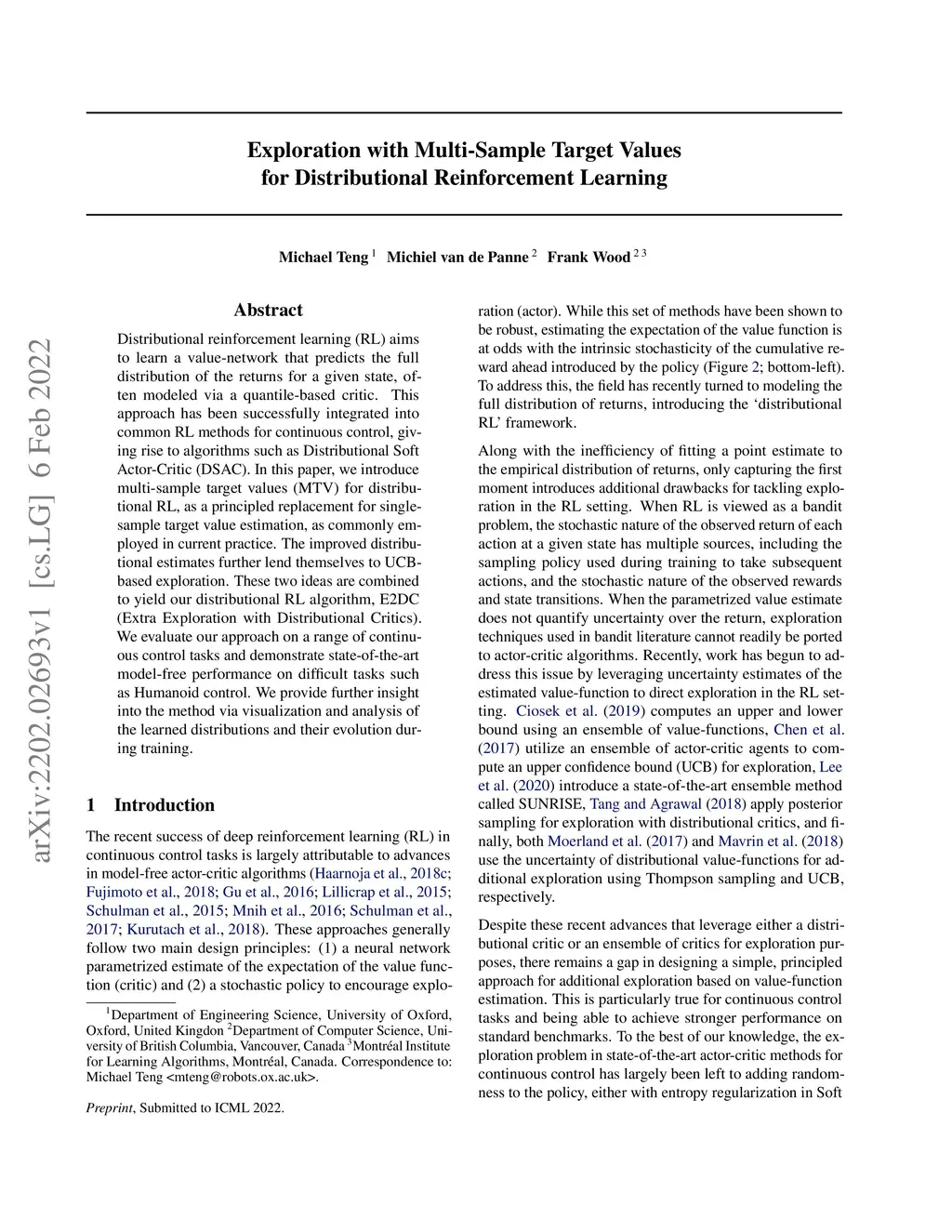 Distributional reinforcement learning (RL) aims to learn a value-network that predicts the full distribution of the returns for a given state, often modeled via a quantile-based critic. This approach has been successfully integrated into common RL methods for continuous control, giving rise to algorithms such as Distributional Soft Actor-Critic (DSAC). In this paper, we introduce multi-sample target values (MTV) for distributional RL, as a principled replacement for single-sample target value estimation, as commonly employed in current practice. The improved distributional estimates further lend themselves to UCB-based exploration. These two ideas are combined to yield our distributional RL algorithm, E2DC (Extra Exploration with Distributional Critics). We evaluate our approach on a range of continuous control tasks and demonstrate state-of-the-art model-free performance on difficult tasks such as Humanoid control. We provide further insight into the method via visualization and analysis of the learned distributions and their evolution during training.