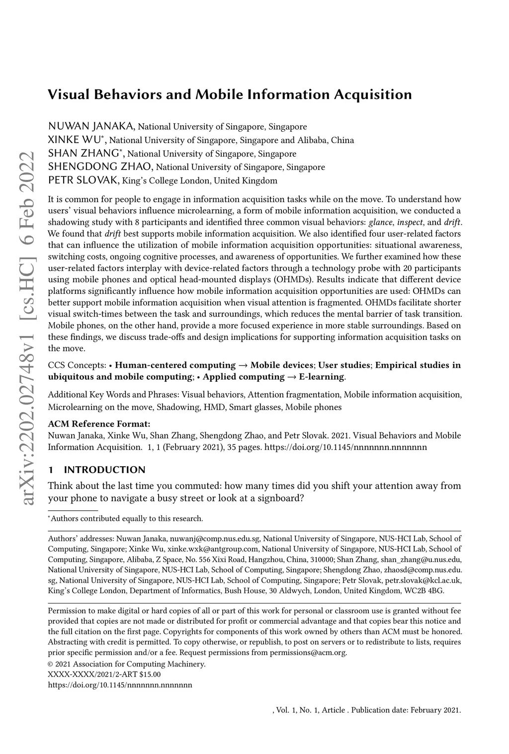 It is common for people to engage in information acquisition tasks while on the move. To understand how users' visual behaviors influence microlearning, a form of mobile information acquisition, we conducted a shadowing study with 8 participants and identified three common visual behaviors: 'glance', ínspect', and 'drift'. We found that 'drift' best supports mobile information acquisition. We also identified four user-related factors that can influence the utilization of mobile information acquisition opportunities: situational awareness, switching costs, ongoing cognitive processes, and awareness of opportunities. We further examined how these user-related factors interplay with device-related factors through a technology probe with 20 participants using mobile phones and optical head-mounted displays (OHMDs). Results indicate that different device platforms significantly influence how mobile information acquisition opportunities are used: OHMDs can better support mobile information acquisition when visual attention is fragmented. OHMDs facilitate shorter visual switch-times between the task and surroundings, which reduces the mental barrier of task transition. Mobile phones, on the other hand, provide a more focused experience in more stable surroundings. Based on these findings, we discuss trade-offs and design implications for supporting information acquisition tasks on the move.