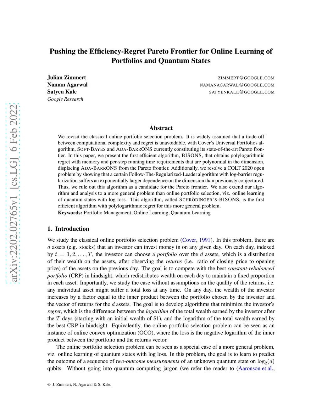 We revisit the classical online portfolio selection problem. It is widely assumed that a trade-off between computational complexity and regret is unavoidable, with Cover's Universal Portfolios algorithm, SOFT-BAYES and ADA-BARRONS currently constituting its state-of-the-art Pareto frontier. In this paper, we present the first efficient algorithm, BISONS, that obtains polylogarithmic regret with memory and per-step running time requirements that are polynomial in the dimension, displacing ADA-BARRONS from the Pareto frontier. Additionally, we resolve a COLT 2020 open problem by showing that a certain Follow-The-Regularized-Leader algorithm with log-barrier regularization suffers an exponentially larger dependence on the dimension than previously conjectured. Thus, we rule out this algorithm as a candidate for the Pareto frontier. We also extend our algorithm and analysis to a more general problem than online portfolio selection, viz. online learning of quantum states with log loss. This algorithm, called SCHRODINGER'S BISONS, is the first efficient algorithm with polylogarithmic regret for this more general problem.