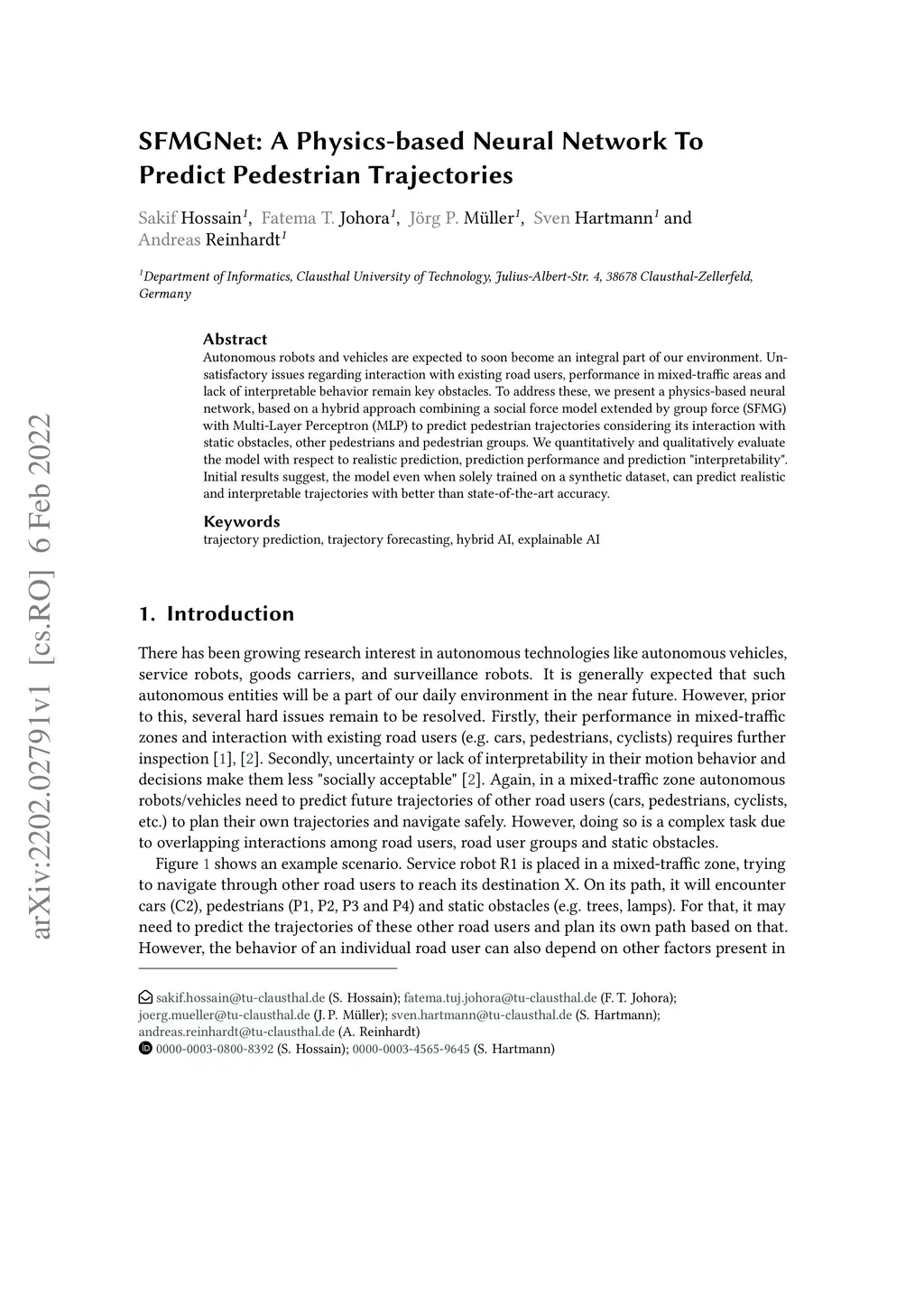 Autonomous robots and vehicles are expected to soon become an integral part of our environment. Unsatisfactory issues regarding interaction with existing road users, performance in mixed-traffic areas and lack of interpretable behavior remain key obstacles. To address these, we present a physics-based neural network, based on a hybrid approach combining a social force model extended by group force (SFMG) with Multi-Layer Perceptron (MLP) to predict pedestrian trajectories considering its interaction with static obstacles, other pedestrians and pedestrian groups. We quantitatively and qualitatively evaluate the model with respect to realistic prediction, prediction performance and prediction "interpretability". Initial results suggest, the model even when solely trained on a synthetic dataset, can predict realistic and interpretable trajectories with better than state-of-the-art accuracy.